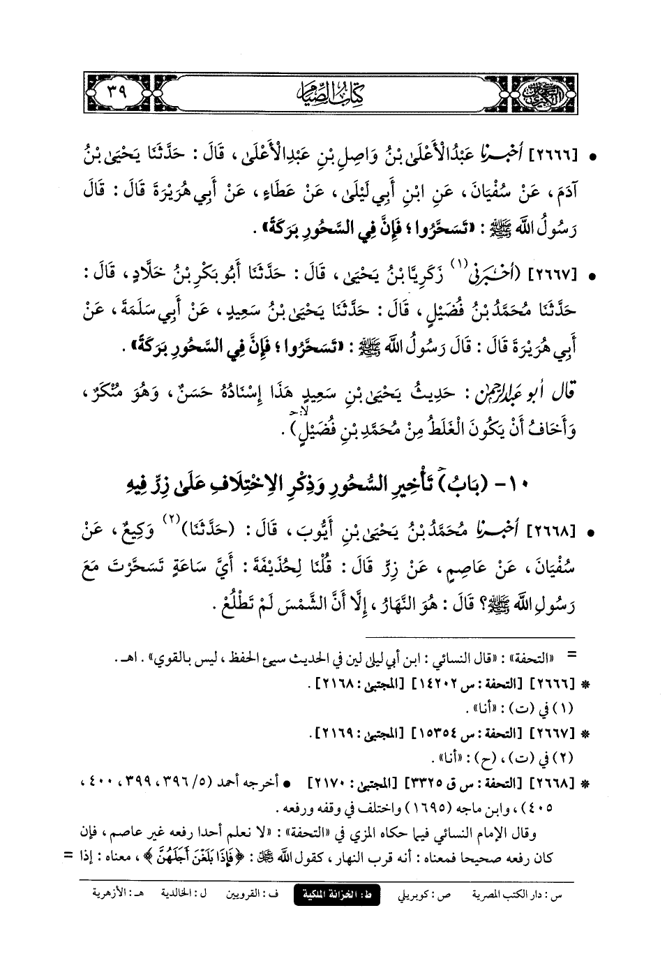 2666- أَخبَرنا عَبدُ الأَعْلَى بنُ وَاصِلِ بْنِ عَبدِ الأَعْلَى، قَالَ: حَدثنا يَحيَى بنُ آدَمَ، عَن سُفْيَانَ، عَنِ ابنِ أَبي لَيْلَى، عَن عَطَاءٍ، عَن أَبي هُرَيرَةَ، قَالَ: قَالَ رَسُولُ اللهِ صَلى الله عَليه وسَلم: تَسَحَّرُوا فَإِنَّ فِي السَّحُورِ بَرَكَةً.