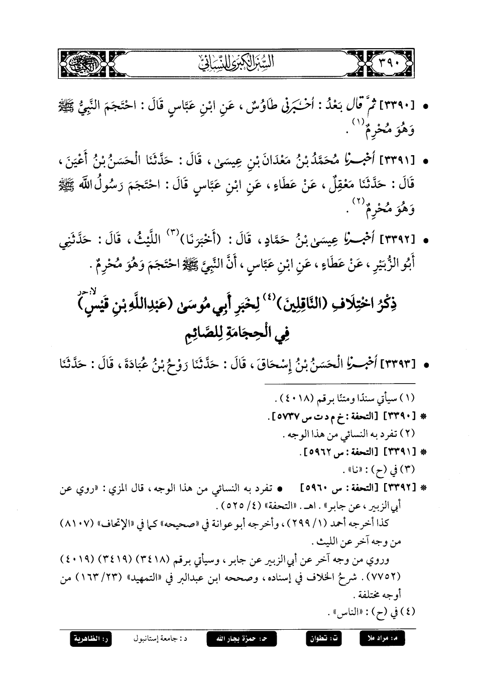 3392- أَخبَرنا عِيسَى بنُ حَمَّادٍ، قَالَ: أَخبَرنا اللَّيْثُ، قَالَ: حَدَّثَنِي أَبو الزُّبَيْرِ، عَن عَطَاءٍ، عَنِ ابنِ عَبَّاسٍ، أَنَّ النَّبِيَّ صَلى الله عَليه وسَلم احْتَجَمَ وَهُوَ مُحْرِمٌ.