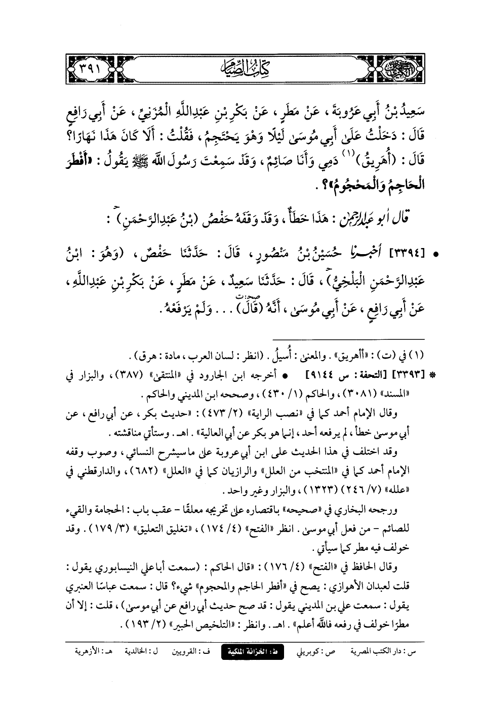 3394- أَخبَرنا حُسَيْنُ بنُ مَنصُورٍ، قَالَ: حَدثنا حَفْصٌ، وَهُوَ ابنُ عَبدِ الرَّحْمنِ البَلْخِيُّ، قَالَ: حَدثنا سَعِيدٌ، عَن مَطَرٍ، عَن بَكْرِ بْنِ عَبدِ اللهِ، عَن أَبي رَافِعٍ، عَن أَبي مُوسَى، أَنَّهُ قَالَ: ... وَلَمْ يَرْفَعْهُ.