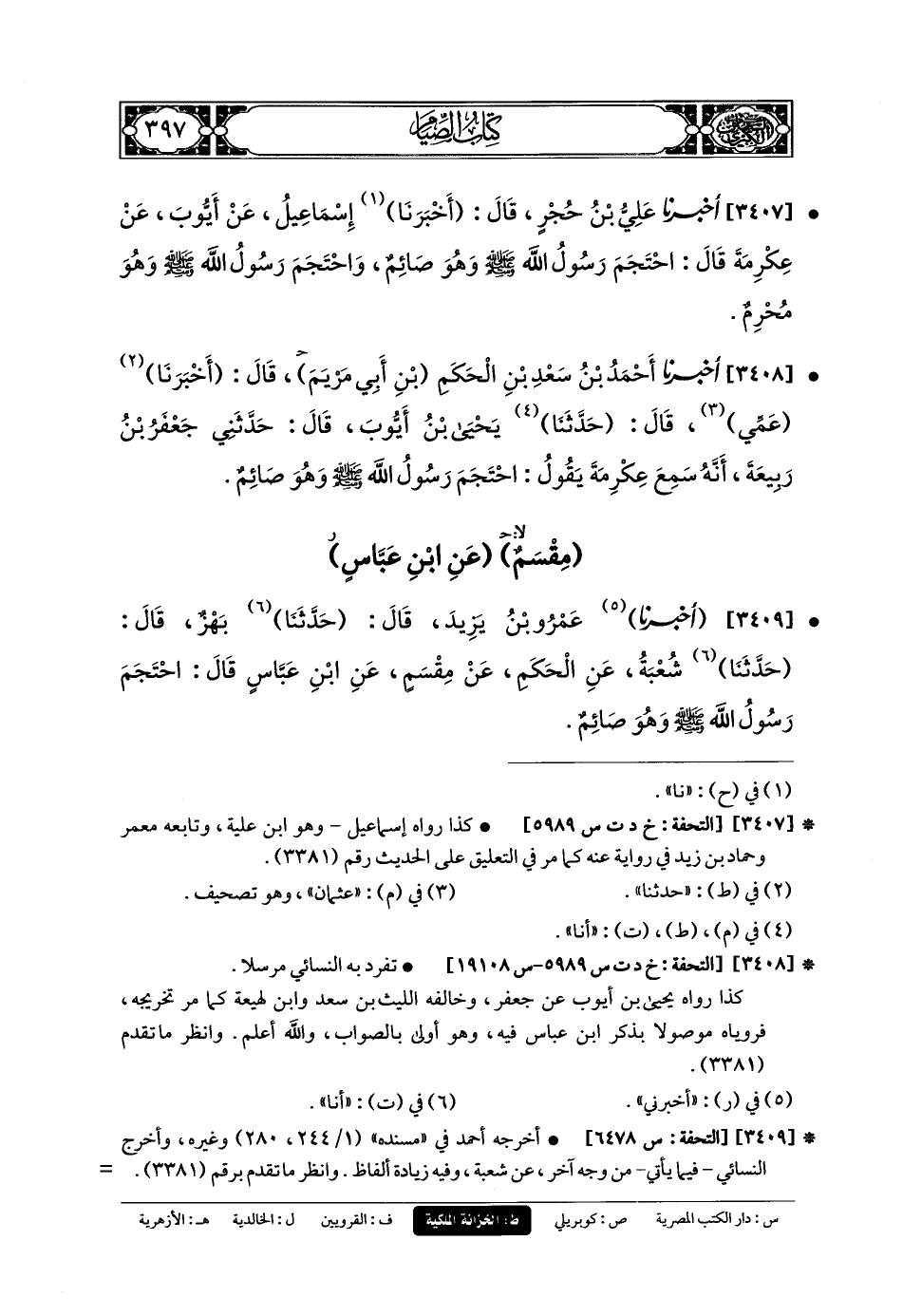 3407- أَخبَرنا عَليُّ بنُ حُجْرٍ، قَالَ: أَخبَرنا إِسمَاعِيلُ، عَن أَيُّوبَ، عَن عِكْرِمَةَ، قَالَ: احْتَجَمَ رَسُولُ اللهِ صَلى الله عَليه وسَلم وَهُوَ صَائِمٌ، وَاحْتَجَمَ رَسُولُ اللهِ صَلى الله عَليه وسَلم وَهُوَ مُحْرِمٌ.
