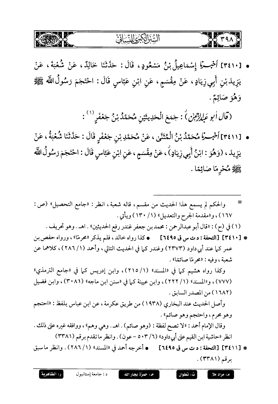 3411- أَخبَرنا مُحَمدُ بنُ المُثَنَّى، عَن مُحَمدِ بْنِ جَعفَرٍ، قَالَ: حَدثنا شُعبَةُ، عَن يَزِيدَ، وَهُوَ بنُ أَبي زِيَادٍ، عَن مِقْسَمٍ، عَنِ ابنِ عَبَّاسٍ، قَالَ: احْتَجَمَ رَسُولُ اللهِ صَلى الله عَليه وسَلم مُحْرِمًا صَائِمًا.