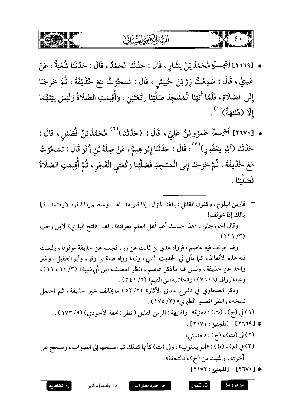 2669- أَخبَرنا مُحَمدُ بنُ بَشَّارٍ، قَالَ: حَدثنا مُحَمدٌ، قَالَ: حَدثنا شُعبَةُ، عَن عَدِيٍّ، قَالَ: سَمِعْتُ زِرَّ بْنَ حُبَيْشٍ، قَالَ: تَسَحَّرْتُ مَعَ حُذَيْفَةَ، ثُمَّ خَرَجْنَا إِلَى الصَّلاةِ، فَلَمَّا أَتَيْنَا المَسْجِدَ صَلَّيْنَا رَكْعَتَيْنِ وَأُقِيمَتِ الصَّلاةُ، وَلَيْسَ بَيْنَهُمَا إِلاَّ هُنَيْهَةٌ.