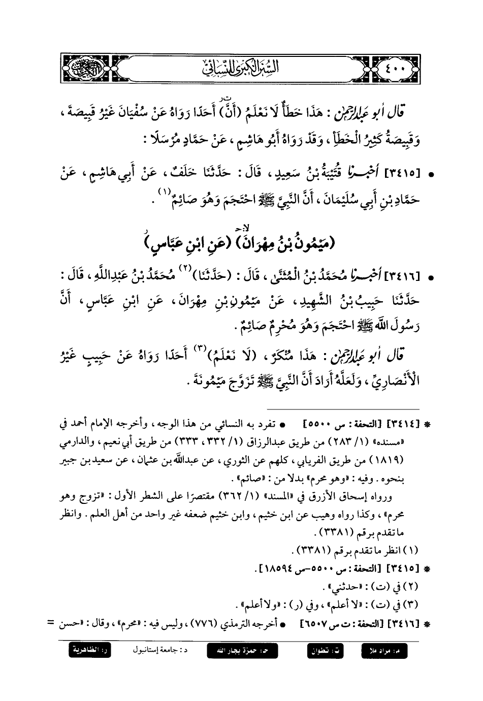 3416- أَخبَرنا مُحَمدُ بنُ المُثَنَّى، قَالَ: حَدثنا مُحَمدُ بنُ عَبدِ اللهِ، قَالَ: حَدثنا حَبِيبُ بنُ الشَّهِيدِ، عَن مَيْمُونِ بْنِ مِهْرَانَ، عَنِ ابنِ عَبَّاسٍ، أَنَّ رَسُولَ اللهِ صَلى الله عَليه وسَلم احْتَجَمَ وَهُوَ مُحْرِمٌ صَائِمٌ.