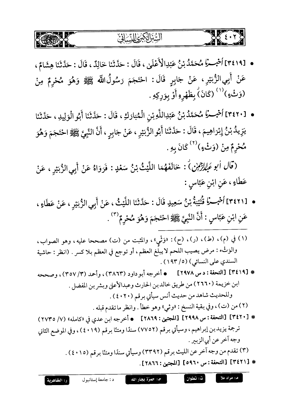 3420- أَخبَرنا مُحَمدُ بنُ عَبدِ اللهِ بْنِ المُبَارَكِ، قَالَ: حَدثنا أَبو الوَلِيدِ، قَالَ: حَدثنا يَزِيدُ بنُ إِبرَاهِيمَ، قَالَ: حَدثنا أَبو الزُّبَيْرِ، عَن جَابِرٍ، أَنَّ النَّبِيَّ صَلى الله عَليه وسَلم احْتَجَمَ وَهُوَ مُحْرِمٌ مِنْ وَثْءٍ كَانَ بِهِ.