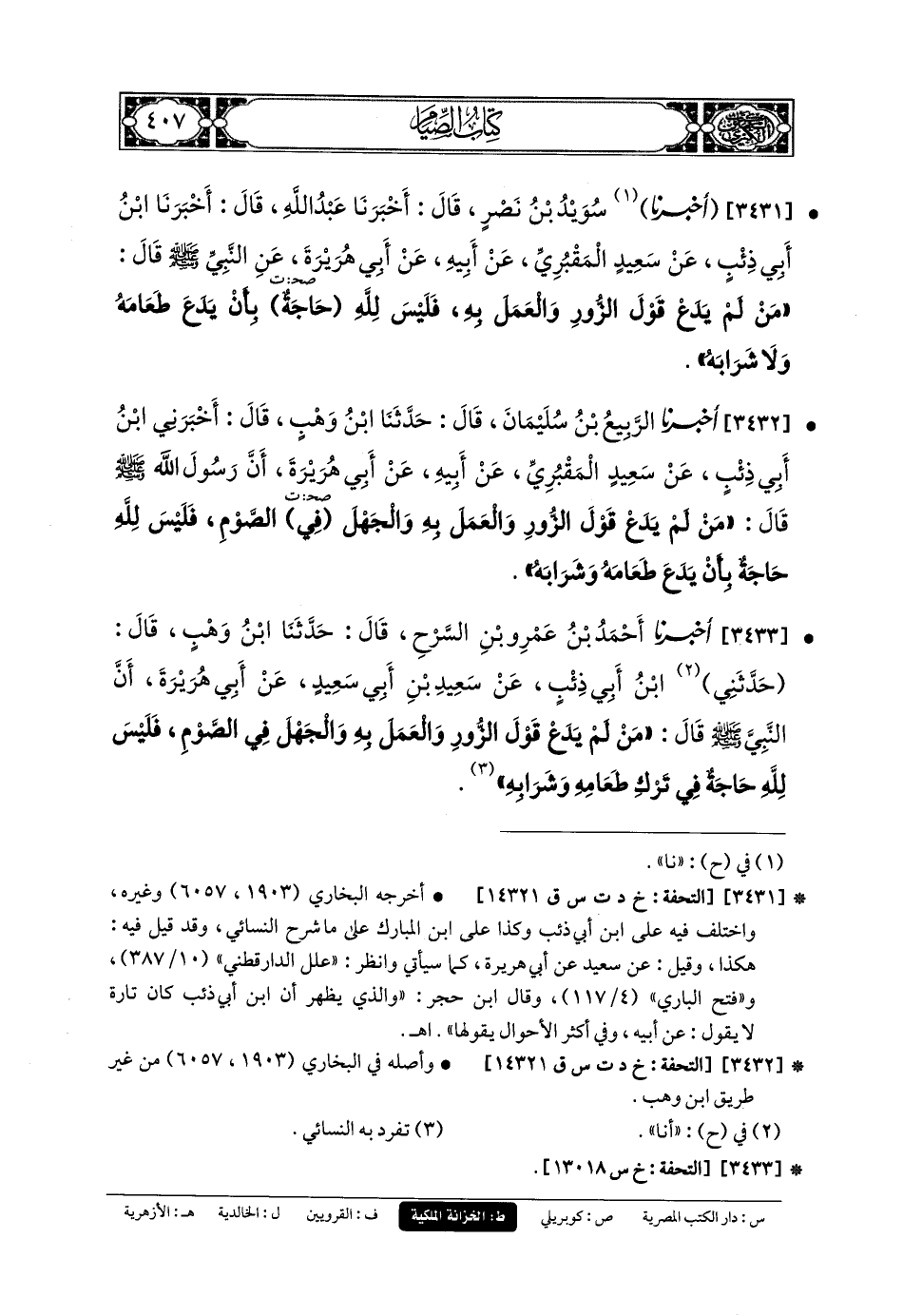 3431- أَخبَرنا سُوَيْدُ بنُ نَصْرٍ، قَالَ: أَخبَرنا عَبدُ اللهِ، قَالَ: أَخبَرنا ابنُ أَبي ذِئْبٍ، عَن سَعِيدٍ المَقْبُرِيِّ، عَن أَبيهِ، عَن أَبي هُرَيرَةَ، عَنِ النَّبِيِّ صَلى الله عَليه وسَلم قَالَ: مَنْ لَمْ يَدَعْ قَوْلَ الزُّورِ، وَالعَمَلَ بِهِ، فَلَيْسَ للهِ حَاجَةٌ بِأَنْ يَدَعَ طَعَامَهُ وَلا شَرَابَهُ.