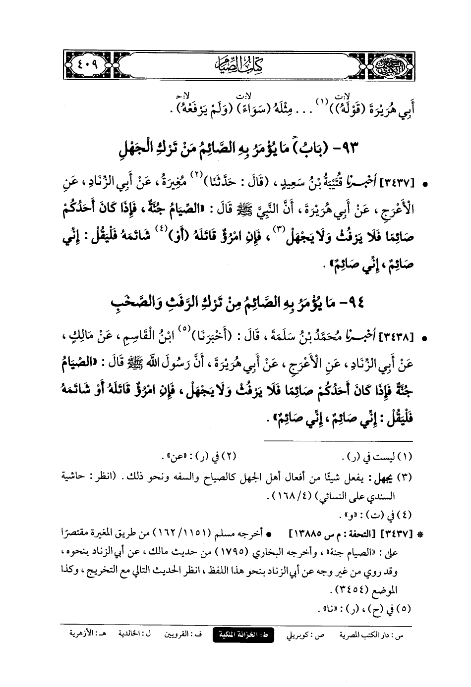 3437- أَخبَرنا قُتَيبَةُ بنُ سَعِيدٍ، قَالَ: حَدثنا مُغِيرَةُ، عَن أَبي الزِّنَادِ، عَنِ الأَعْرَجِ، عَن أَبي هُرَيرَةَ، أَنَّ النَّبِيَّ صَلى الله عَليه وسَلم قَالَ: الصِّيَامُ جُنَّةٌ، فَإِذَا كَانَ أَحَدُكُمْ صَائِمًا فَلا يَرْفُثْ، وَلا يَجْهَلْ، فَإِنِ امْرُؤٌ قَاتَلَهُ أَوْ شَاتَمَهُ، فَلْيَقُلْ: إِنِّي صَائِمٌ، إِنِّي صَائِمٌ.