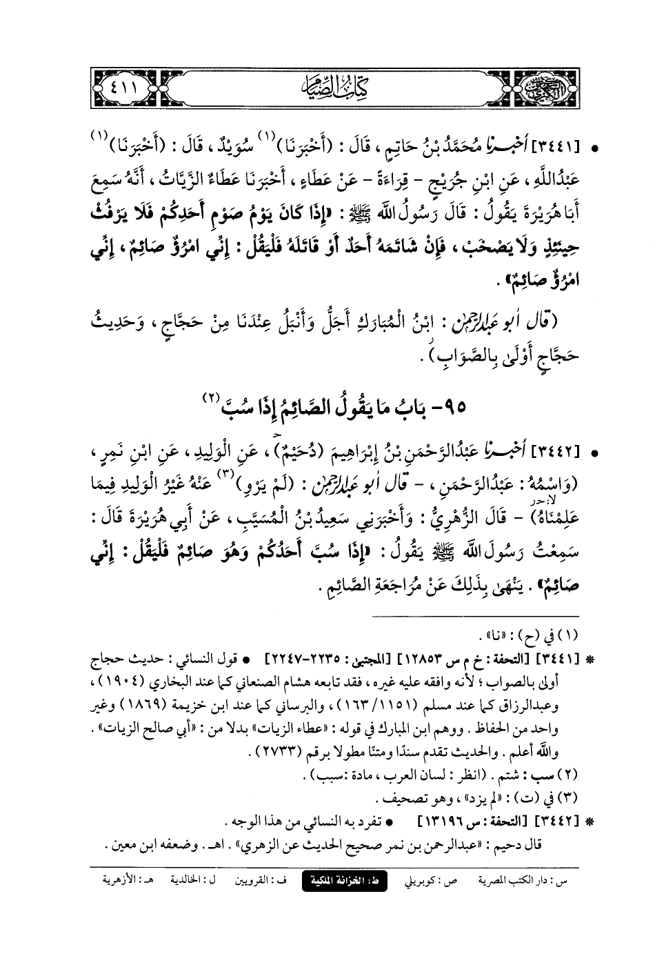 3441- أَخبَرنا مُحَمدُ بنُ حَاتِمٍ، قَالَ: أَخبَرنا سُوَيْدٌ، قَالَ: أَخبَرنا عَبدُ اللهِ، عَنِ ابنِ جُرَيْجٍ، قِرَاءَةً عَن عَطَاءٍ، أَخبَرنا عَطَاءٌ الزَّيَّاتُ، أَنَّهُ سَمِعَ أَبَا هُرَيرَةَ يَقُولُ: قَالَ رَسُولُ اللهِ صَلى الله عَليه وسَلم: إِذَا كَانَ يَوْمُ صَوْمِ أَحَدِكُمْ فَلا يَرْفُثْ حِينَئِذٍ، وَلا يَصْخَبْ، فَإِنْ شَاتَمَهُ أَحَدٌ أَوْ قَاتَلَهُ، فَلْيَقُلْ: إِنِّي امْرُؤٌ صَائِمٌ، إِنِّي امْرُؤٌ صَائِمٌ.