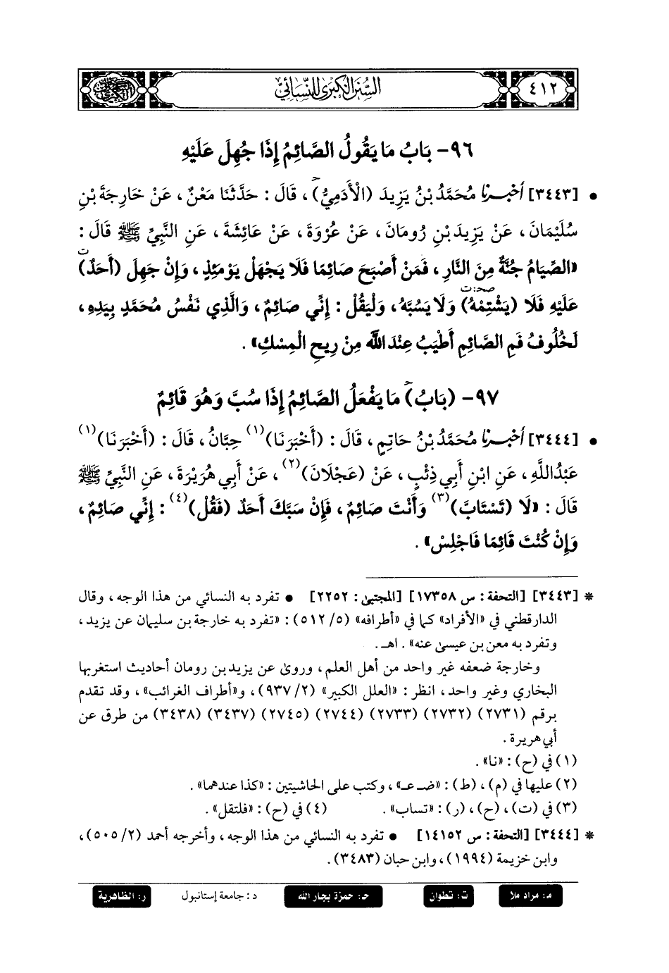 3444- أَخبَرنا مُحَمدُ بنُ حَاتِمٍ، قَالَ: أَخبَرنا حِبَّانُ، قَالَ: أَخبَرنا عَبدُ اللهِ، عَنِ ابنِ أَبي ذِئْبٍ، عَن عَجْلانَ، عَن أَبي هُرَيرَةَ، عَنِ النَّبِيِّ صَلى الله عَليه وسَلم قَالَ: لا تَسْتَابَّ وَأَنْتَ صَائِمٌ، فَإِنْ سَبَّكَ أَحَدٌ، فَقُلْ: إِنِّي صَائِمٌ، وَإِنْ كُنْتَ قَائِمًا فَاجْلِسْ.