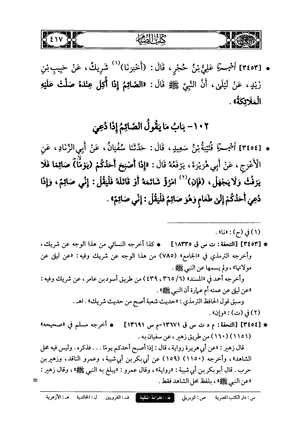 3454- أَخبَرنا قُتَيبَةُ بنُ سَعِيدٍ، قَالَ: حَدثنا سُفْيَانُ، عَن أَبي الزِّنَادِ، عَنِ الأَعْرَجِ، عَن أَبي هُرَيرَةَ يَرْفَعُهُ قَالَ: إِذَا أَصْبَحَ أَحَدُكُمْ يَوْمًا صَائِمًا فَلا يَرْفُثْ وَلا يَجْهَلْ، فَإِنِ امْرُؤٌ شَاتَمَهُ أَوْ قَاتَلَهُ، فَلْيَقُلْ: إِنِّي صَائِمٌ، وَإِذَا دُعِيَ أَحَدُكُمْ إِلَى طَعَامٍ وَهُوَ صَائِمٌ، فَلْيَقُلْ: إِنِّي صَائِمٌ.
