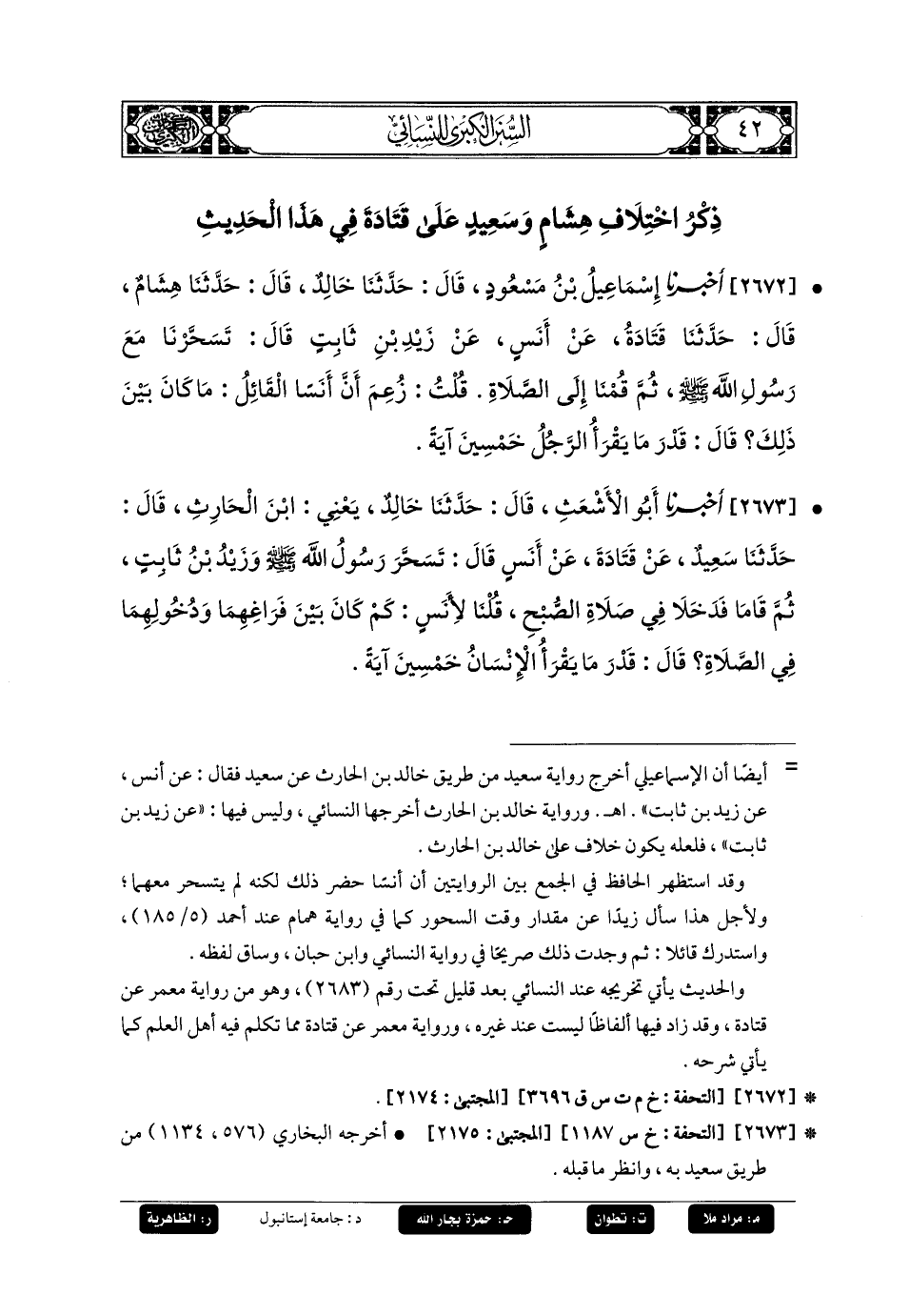 2672- أَخبَرنا إِسمَاعِيلُ بنُ مَسْعُودٍ، قَالَ: حَدثنا خَالِدٌ، قَالَ: حَدثنا هِشَامٌ، قَالَ: حَدثنا قَتَادَةُ، عَن أَنَسٍ، عَن زَيْدِ بْنِ ثَابِتٍ، قَالَ: تَسَحَّرْنَا مَعَ رَسُولِ اللهِ صَلى الله عَليه وسَلم، ثُمَّ قُمْنَا إِلَى الصَّلاةِ، قُلْتُ: زُعِمَ أَنَّ أَنَسًا القَائِلُ: مَا كَانَ بَيْنَ ذَلِكَ، قَالَ: قَدْرُ مَا يَقْرَأُ الرَّجُلُ خَمْسِينَ آيَةً.