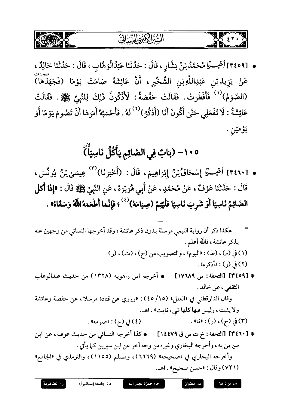 3459- أَخبَرنا مُحَمدُ بنُ بَشَّارٍ، قَالَ: حَدثنا عَبدُ الوَهَّابِ، قَالَ: حَدثنا خَالِدٌ، عَن يَزِيدَ بْنِ عَبدِ اللهِ بْنِ الشِّخِّيرِ، أَنَّ عَائِشَةَ صَامَتْ يَوْمًا، فَجَهَدَهَا الصَّوْمُ، فَأَفْطَرَتْ، فَقَالَتْ حَفْصَةُ: لأَذْكُرَنَّ ذَلِكَ لِلنَّبِيِّ صَلى الله عَليه وسَلم، فَقَالَتْ عَائِشَةُ: لا تَفْعَلِي حَتَّى أَكُونَ أَنَا أَذْكُرُ لَهُ، فَأَحْسَبُهُ أَمَرَهَا أَنْ تَصُومَ يَوْمًا أَوْ يَوْمَيْنِ.