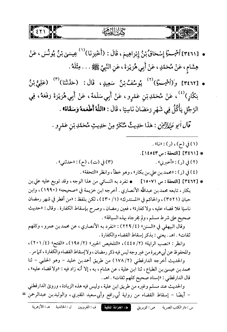 3461- أَخبَرنا إِسحَاقُ بنُ إِبرَاهِيمَ، قَالَ: أَخبَرنا عِيسَى بنُ يُونُسَ، عَن هِشَامٍ، عَن مُحَمدٍ، عَن أَبي هُرَيرَةَ، عَنِ النَّبِيِّ صَلى الله عَليه وسَلم، ... مِثْلَهُ.