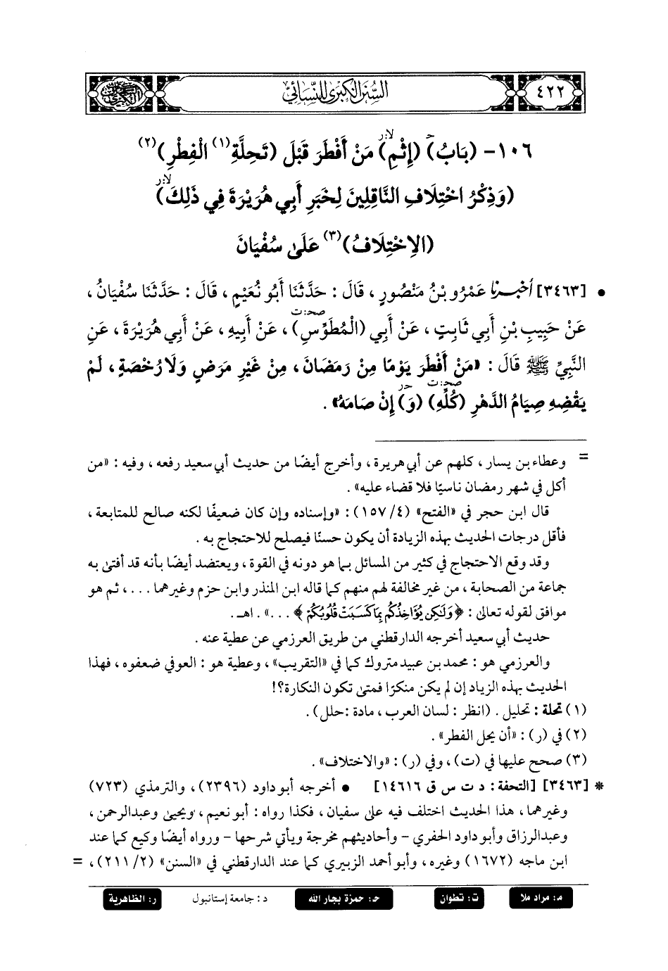 3463- أَخبَرنا عَمرُو بنُ مَنصُورٍ، قَالَ: حَدثنا أَبو نُعَيْمٍ، قَالَ: حَدثنا سُفْيَانُ، عَن حَبِيبِ بْنِ أَبي ثَابِتٍ، عَن أَبي المُطَوِّسِ، عَن أَبيهِ، عَن أَبي هُرَيرَةَ، عَنِ النَّبِيِّ صَلى الله عَليه وسَلم قَالَ: مَنْ أَفْطَرَ يَوْمًا مِنْ رَمَضَانَ مِنْ غَيْرِ مَرَضٍ وَلا رُخْصَةٍ، لَمْ يَقْضِهِ صِيَامُ الدَّهْرِ كُلِّهِ وإِنْ صَامَهُ.