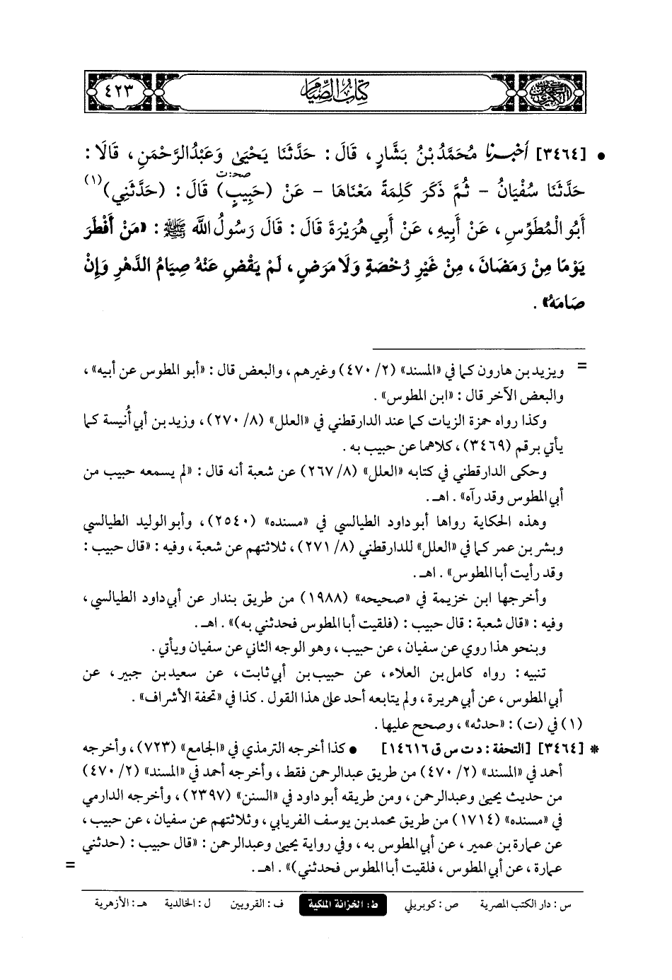 3464- أَخبَرنا مُحَمدُ بنُ بَشَّارٍ، قَالَ: حَدثنا يَحيَى، وَعَبدُ الرَّحْمَنِ، قَالا: حَدثنا سُفْيَانُ، ثُمَّ ذَكَرَ كَلِمَةَ مَعْنَاهَا، عَن حَبِيبٍ، قَالَ: حَدَّثَنِي أَبو المُطَوِّسِ، عَن أَبيهِ، عَن أَبي هُرَيرَةَ قَالَ: قَالَ رَسُولُ اللهِ صَلى الله عَليه وسَلم: مَنْ أَفْطَرَ يَوْمًا مِنْ رَمَضَانَ مِنْ غَيْرِ رُخْصَةٍ وَلا مَرَضٍ، لَمْ يَقْضِ عَنهُ صِيَامُ الدَّهْرِ وَإِنْ صَامَهُ.