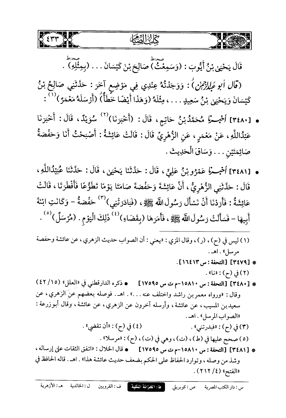 3481- أَخبَرنا عَمرُو بنُ عَليٍّ، قَالَ: حَدثنا يَحيَى، قَالَ: حَدثنا عُبَيدُ اللهِ، قَالَ: حَدَّثَنِي الزُّهْرِيُّ، أَنَّ عَائِشَةَ، وَحَفْصَةَ صَامَتًا يَوْمًا تَطَوُّعًا، فَأَفْطَرَتَا، قَالَتْ عَائِشَةُ: فَأَرَدْنَا أَنْ نَسْأَلَ رَسُولَ اللهِ صَلى الله عَليه وسَلم، فَبَادَرَتْنِي حَفْصَةُ، وَكَانَتِ ابنَةَ أَبيهَا، فَسَأَلَتْ رَسُولَ اللهِ صَلى الله عَليه وسَلم، فَأَمَرَهَا بِقَضَاءِ ذَلِكَ اليَوْمِ، مُرْسَلٌ.
