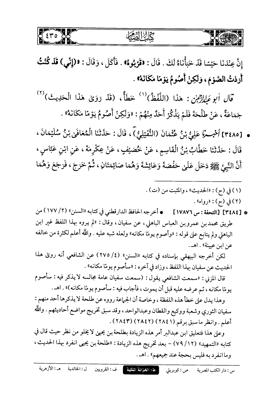 3485- أَخبَرنا عَليُّ بنُ عُثْمَانَ النُّفَيْلِيُّ، قَالَ: حَدثنا المُعَافَى بنُ سُلَيمَانَ، قَالَ: حَدثنا خَطَّابُ بنُ القَاسِمِ، عَن خُصَيْفٍ، عَن عِكْرِمَةَ، عَنِ ابنِ عَبَّاسٍ، أَنَّ النَّبِيَّ صَلى الله عَليه وسَلم دَخَلَ عَلَى حَفْصَةَ، وَعَائِشَةَ وَهُمَا صَائِمَتَانِ، ثُمَّ خَرَجَ فَرَجَعَ وَهُمَا يَأْكُلانِ، فَقَالَ: أَلَمْ تَكُونَا صَائِمَتَيْنِ؟ قَالَتَا: بَلَى، وَلَكِنْ أُهْدِيَ لَنَا طَعَامٌ، فَأَعْجَبَنَا، فَأَكَلْنَا مِنْهُ، قَالَ: صُومَا يَوْمًا مَكَانَهُ.