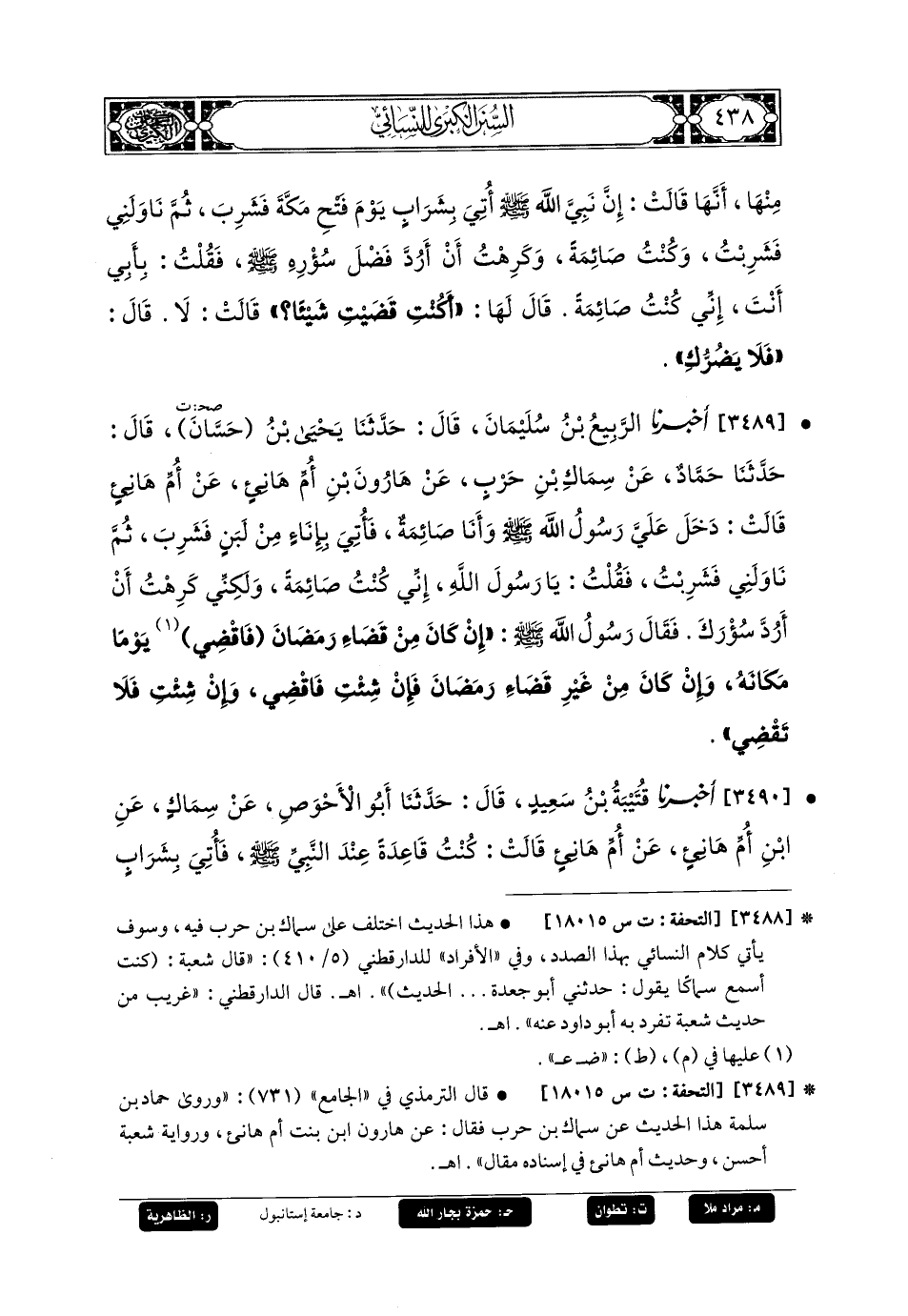 3489- أَخبَرنا الرَّبِيعُ بنُ سُلَيمَانَ، قَالَ: حَدثنا يَحيَى بنُ حَسَّانَ، قَالَ: حَدثنا حَمَّادٌ، عَن سِمَاكِ بْنِ حَرْبٍ، عَن هَارُونَ بْنِ أُمِّ هَانِئٍ، عَن أُمِّ هَانِئٍ، قَالَتْ: دَخَلَ عَلَيَّ رَسُولُ اللهِ صَلى الله عَليه وسَلم وَأَنَا صَائِمَةٌ، فَأُتِيَ بِإِنَاءٍ مِنْ لَبَنٍ فَشَرِبَ، ثُمَّ نَاوَلَنِي فَشَرِبْتُ، فَقُلْتُ: يَا رَسُولَ اللهِ، إِنِّي كُنْتُ صَائِمَةً، وَلَكِنِّي كَرِهْتُ أَنْ أَرُدَّ سُؤْرَكَ، فَقَالَ رَسُولُ اللهِ صَلى الله عَليه وسَلم: إِنْ كَانَ مِنْ قَضَاءِ رَمَضَانَ، فَاقْضِي يَوْمًا مَكَانَهُ، وَإِنْ كَانَ مِنْ غَيْرِ قَضَاءِ رَمَضَانَ، فَإِنْ شِئْتِ فَاقْضِي، وَإِنْ شِئْتِ فَلا تَقْضِي.