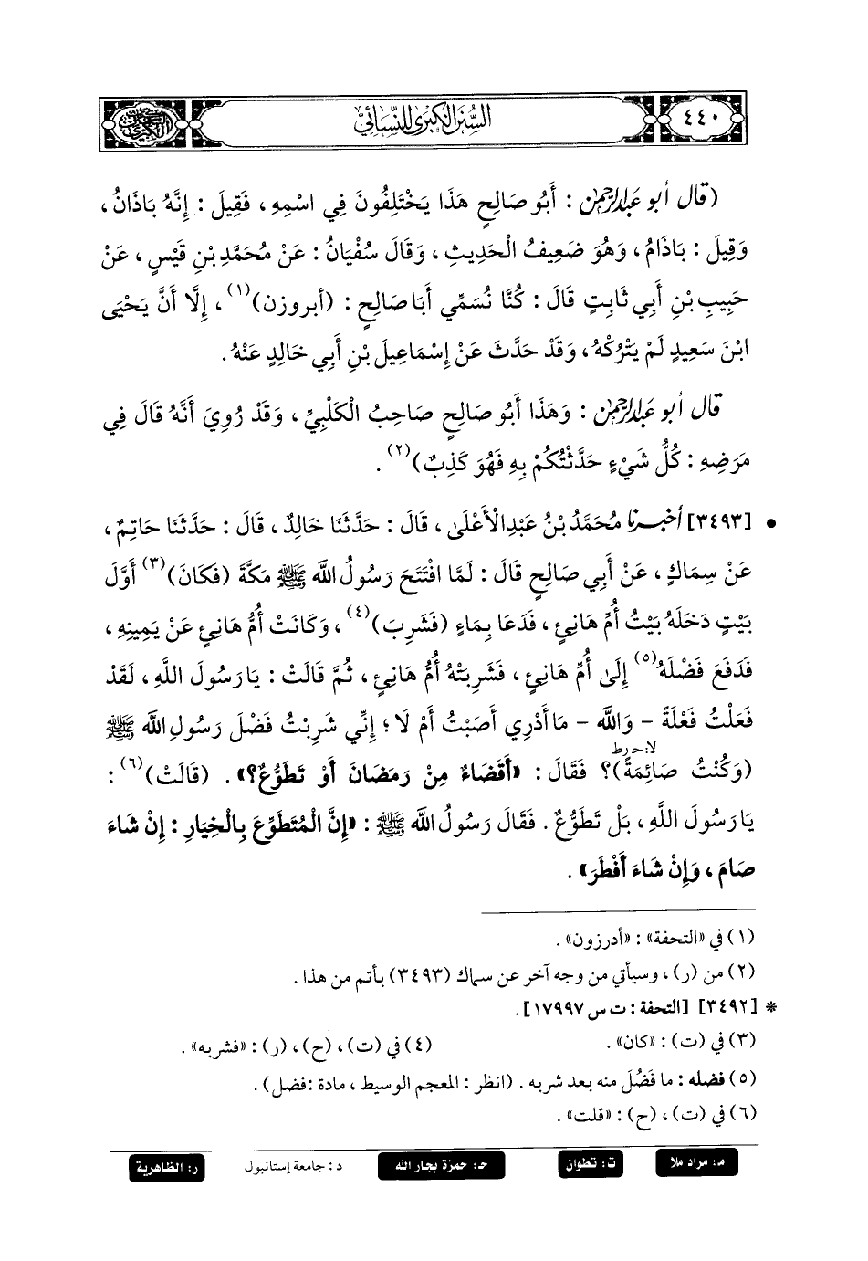 3493- أَخبَرنا مُحَمدُ بنُ عَبدِ الأَعْلَى، قَالَ: حَدثنا خَالِدٌ، قَالَ: حَدثنا حَاتِمٌ، عَن سِمَاكٍ، عَن أَبي صَالِحٍ قَالَ: لَمَّا افْتَتَحَ رَسُولُ اللهِ صَلى الله عَليه وسَلم مَكَّةَ، فَكَانَ أَوَّلَ بَيْتٍ دَخَلَهُ بَيْتُ أُمِّ هَانِئٍ، فَدَعَا بِمَاءٍ فَشَرِبَ، وَكَانَتْ أُمُّ هَانِئٍ عَن يَمِينِهِ، فَدَفَعَ فَضْلَهُ إِلَى أُمِّ هَانِئٍ، فَشَرِبَتْهُ أُمُّ هَانِئٍ، ثُمَّ قَالَتْ: يَا رَسُولَ اللهِ، لَقَدْ فَعَلْتُ فَعْلَةً، وَاللهِ مَا أَدْرِي أَصَبْتُ أَمْ لا، إِنِّي شَرِبْتُ فَضْلَ رَسُولِ اللهِ صَلى الله عَليه وسَلم، وَكُنْتُ صَائِمَةً (1)، فَقَالَ: أَقَضَاءٌ مِنْ رَمَضَانَ أَوْ تَطَوُّعٌ؟ قَالَتَ: يَا رَسُولَ اللهِ، بَلْ تَطَوُّعٌ، فَقَالَ رَسُولُ اللهِ صَلى الله عَليه وسَلم: إِنَّ المُتَطَوِّعَ بِالخِيَارِ، إِنْ شَاءَ صَامَ، وَإِنْ شَاءَ أَفْطَرَ.