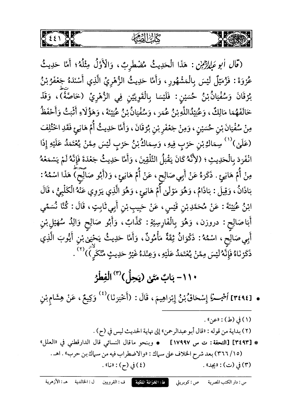 قَالَ أَبو عَبدِ الرَّحْمَنِ: هَذَا الحَدِيثُ مُضْطَرِبٌ، وَالأَوَّلُ مِثْلُهُ، أَمَّا حَدِيثُ عُرْوَةَ: فَزُمَيْلٌ لَيْسَ بِالمَشْهُورِ، وَأَمَّا حَدِيثُ الزُّهْرِيِّ الَّذِي أَسْنَدَهُ جَعفَرُ بنُ بُرْقَانَ، وَسُفْيَانُ بنُ حُسَيْنٍ، فَلَيْسَا بِالقَوِيَّيْنِ فِي الزُّهْرِيِّ خَاصَّةً، وَقَدْ خَالَفَهُمَا مَالِكٌ، وَعُبَيدُ اللهِ بنُ عُمَرَ، وَسُفْيَانُ بنُ عُيَيْنَةَ، وَهَؤُلاءِ أَثْبَتُ وَأَحْفَظُ مِنْ سُفْيَانَ بْنِ حُسَيْنٍ، وَمِنْ جَعفَرِ بْنِ بُرْقَانَ، وَأَمَّا حَدِيثُ أُمِّ هَانِئٍ: فَقَدِ اخْتُلِفَ عَلَى سِمَاكِ بْنِ حَرْبٍ فِيهِ، وَسِمَاكُ بنُ حَرْبٍ لَيْسَ مِمَّنْ يُعْتَمَدُ عَلَيْهِ إِذَا انْفَرَدَ بِالحَدِيثِ، لأَنَّهُ كَانَ يَقْبَلُ التَّلْقِينَ، وَأَمَّا حَدِيثُ جَعْدَةَ: فَإِنَّهُ لَمْ يَسْمَعْهُ مِنْ أُمِّ هَانِئٍ، ذَكَرَهُ عَن أَبي صَالِحٍ، عَن (1) أُمِّ هَانِئٍ، وَأَبو صَالِحٍ هَذَا، اسْمُهُ: بَاذَانُ، وَقِيلَ: بَاذَامُ (2)، وَهُوَ مَوْلَى أُمِّ هَانِئٍ، وَهُوَ الَّذِي يَرْوِي عَنهُ الكَلْبِيُّ، قَالَ ابنُ عُيَيْنَةَ: عَن مُحَمدِ بْنِ قَيسٍ، عَن حَبِيبِ بْنِ أَبي ثَابِتٍ قَالَ: كُنَّا نُسَمِّي أَبَا صَالِحٍ: دُرُوْزَنْ، وَهُوَ بِالفَارِسِيَّةِ كَذَّابٌ، وَأَبو صَالِحٍ وَالِدُ سُهَيلِ بْنِ أَبي صَالِحٍ، اسْمُهُ: ذَكْوَانُ، ثِقَةٌ مَأْمُونٌ، وَأَمَّا حَدِيثُ يَحيَى بْنِ أَيُّوبَ الَّذِي ذَكَرْنَاهُ: فَإِنَّهُ لَيْسَ مِمَّنْ يُعْتَمَدُ عَلَيْهِ، وَعِنْدَهُ غَيْرُ حَدِيثٍ مُنْكَرٍ.