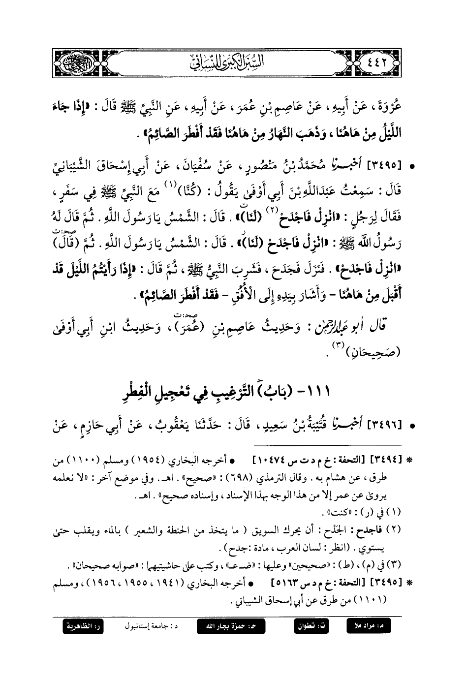 3495- أَخبَرنا مُحَمدُ بنُ مَنصُورٍ، عَن سُفْيَانَ، عَن أَبي إِسحَاقَ الشَّيْبَانِيِّ، قَالَ: سَمِعْتُ عَبدَ اللهِ بْنَ أَبي أَوْفَى، يَقُولُ: كُنَّا مَعَ النَّبِيِّ صَلى الله عَليه وسَلم فِي سَفَرٍ، فَقَالَ لِرَجُلٍ: انْزِلْ فَاجْدَحْ لَنَا، قَالَ: الشَّمْسُ يَا رَسُولَ اللهِ، ثُمَّ قَالَ لَهُ رَسُولُ اللهِ صَلى الله عَليه وسَلم: انْزِلْ فَاجْدَحْ لَنَا، قَالَ: الشَّمْسُ يَا رَسُولَ اللهِ، ثُمَّ قَالَ: انْزِلْ فَاجْدَحْ، فَنَزَلَ فَجَدَحَ، فَشَرِبَ النَّبِيُّ صَلى الله عَليه وسَلم، ثُمَّ قَالَ: إِذَا رَأَيْتُمُ اللَّيْلَ قَدْ أَقْبَلَ مِنْ هَاهُنَا، وَأَشَارَ بِيَدِهِ إِلَى الأُفُقِ، فَقَدْ أَفْطَرَ الصَّائِمُ.