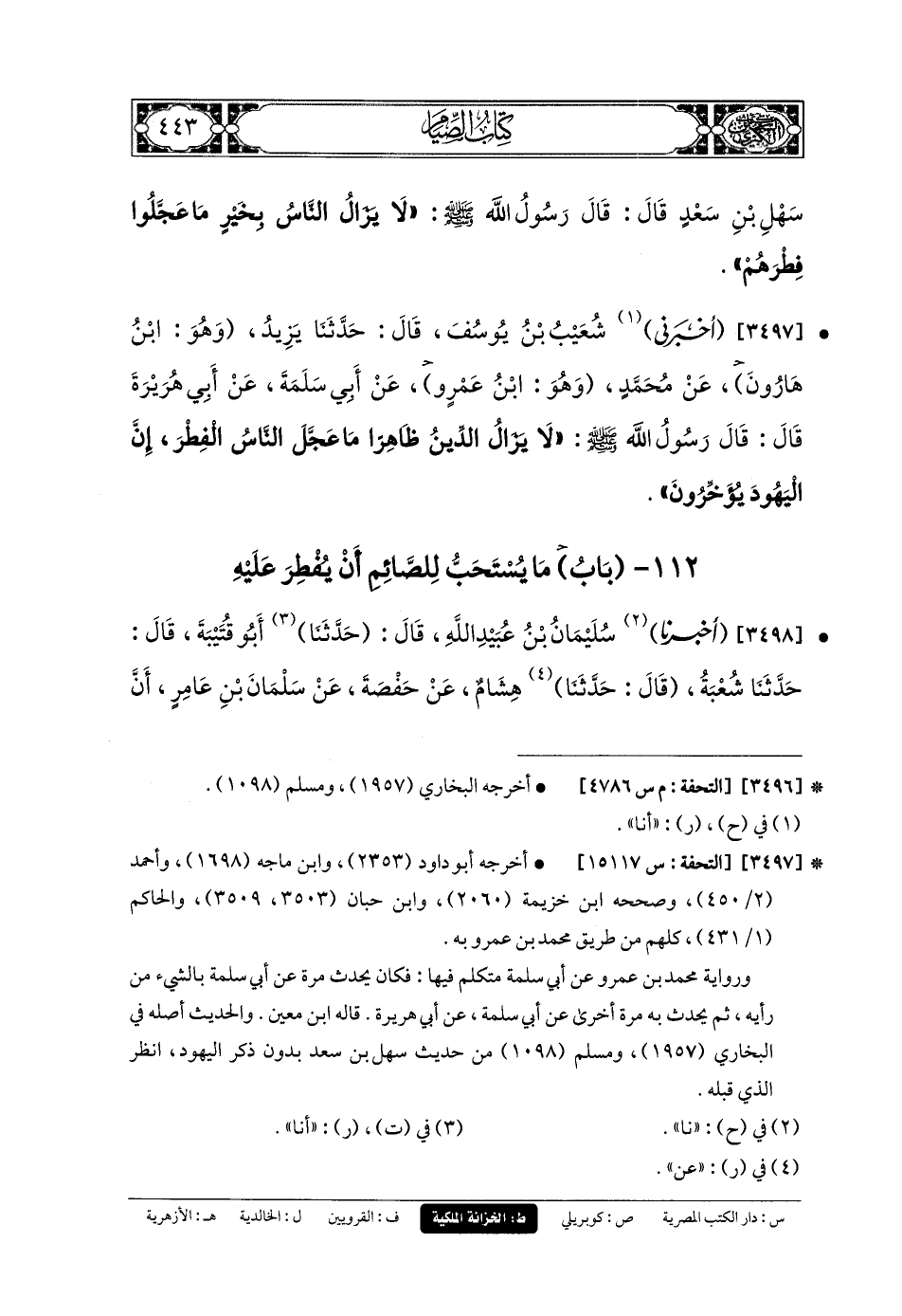 3497- أَخبَرني شُعَيبُ بنُ يُوسُفَ، قَالَ: حَدثنا يَزِيدُ، وَهُوَ ابنُ هَارُونَ، عَن مُحَمدٍ، وَهُوَ ابنُ عَمْرٍو، عَن أَبي سَلَمَةَ، عَن أَبي هُرَيرَةَ قَالَ: قَالَ رَسُولُ اللهِ صَلى الله عَليه وسَلم: لا يَزَالُ الدِّينُ ظَاهِرًا مَا عَجَّلَ النَّاسُ الفِطْرَ، إِنَّ اليَهُودَ يُؤَخِّرُونَ.
