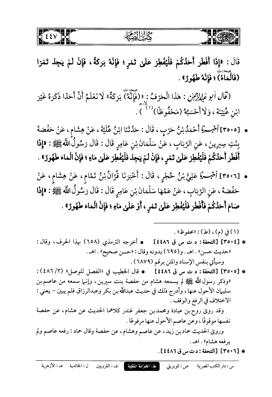 3505- أَخبَرنا أَحْمَدُ بنُ حَرْبٍ، قَالَ: حَدثنا ابنُ عُلَيَّةَ، عَن هِشَامٍ، عَن حَفْصَةَ بِنْتِ سِيرِينَ، عَنِ الرَّبَابِ، عَن سَلْمَانَ بْنِ عَامِرٍ قَالَ: قَالَ رَسُولُ اللهِ صَلى الله عَليه وسَلم: إِذَا أَفْطَرَ أَحَدُكُمْ فَلْيُفْطِرْ عَلَى تَمْرٍ، فَإِنْ لَمْ يَجِدْ فَلْيُفْطِرْ عَلَى مَاءٍ، فَإِنَّ المَاءَ طَهُورٌ.