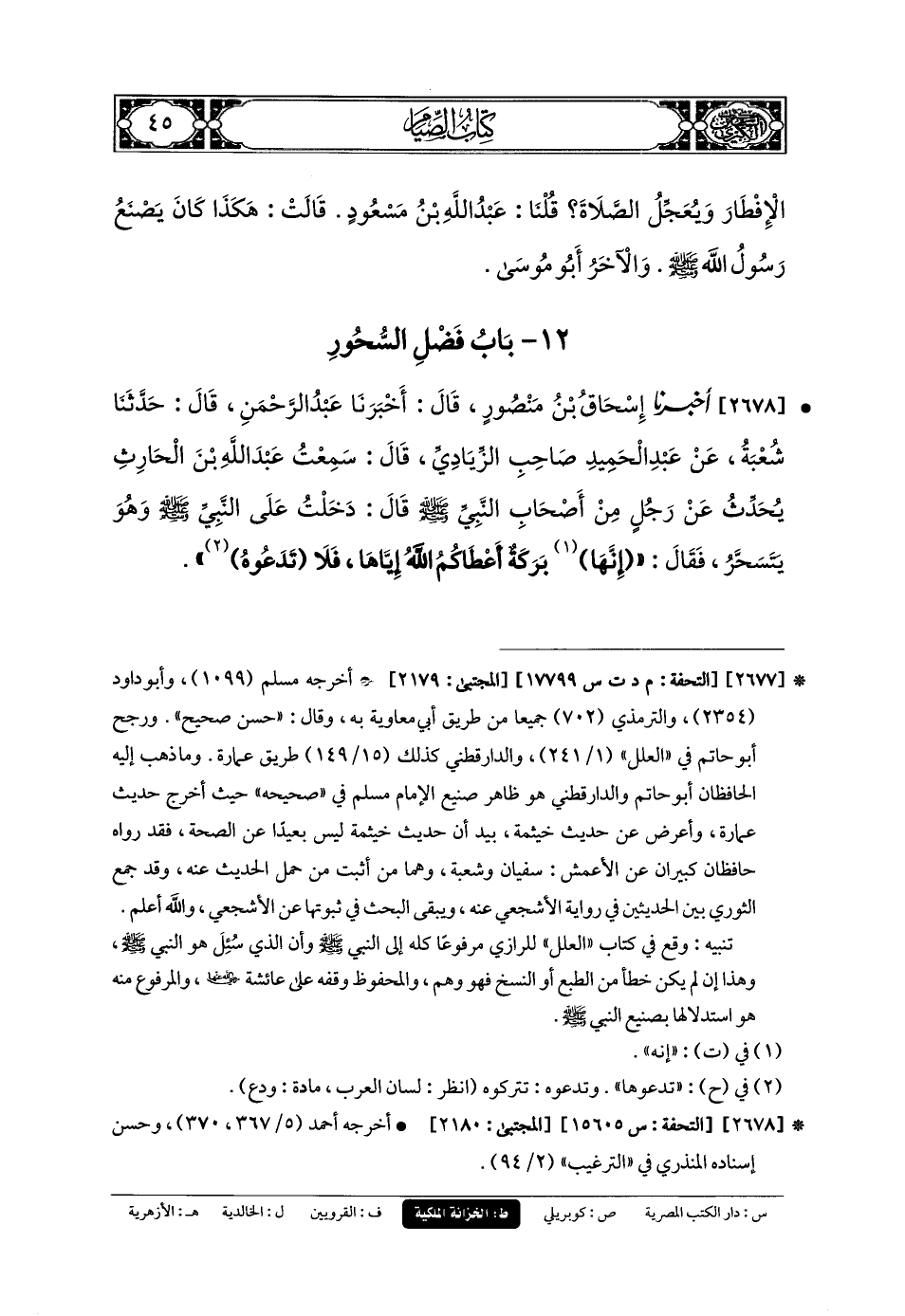 2678- أَخبَرنا إِسحَاقُ بنُ مَنصُورٍ، قَالَ: أَخبَرنا عَبدُ الرَّحْمَنِ، قَالَ: حَدثنا شُعبَةُ، عَن عَبدِ الحَمِيدِ، صَاحِبِ الزِّيَادِيِّ، قَالَ: سَمِعْتُ عَبدَ اللهِ بْنَ الحَارِثِ، يُحَدِّثُ عَن رَجُلٍ مِنْ أَصْحَابِ النَّبِيِّ صَلى الله عَليه وسَلم قَالَ: دَخَلْتُ عَلَى النَّبِيِّ صَلى الله عَليه وسَلم وَهُوَ يَتَسَحَّرُ، فَقَالَ: إِنَّهَا بَرَكَةٌ أَعْطَاكُمُ اللهُ إِيَّاهَا، فَلا تَدَعُوهُ.
