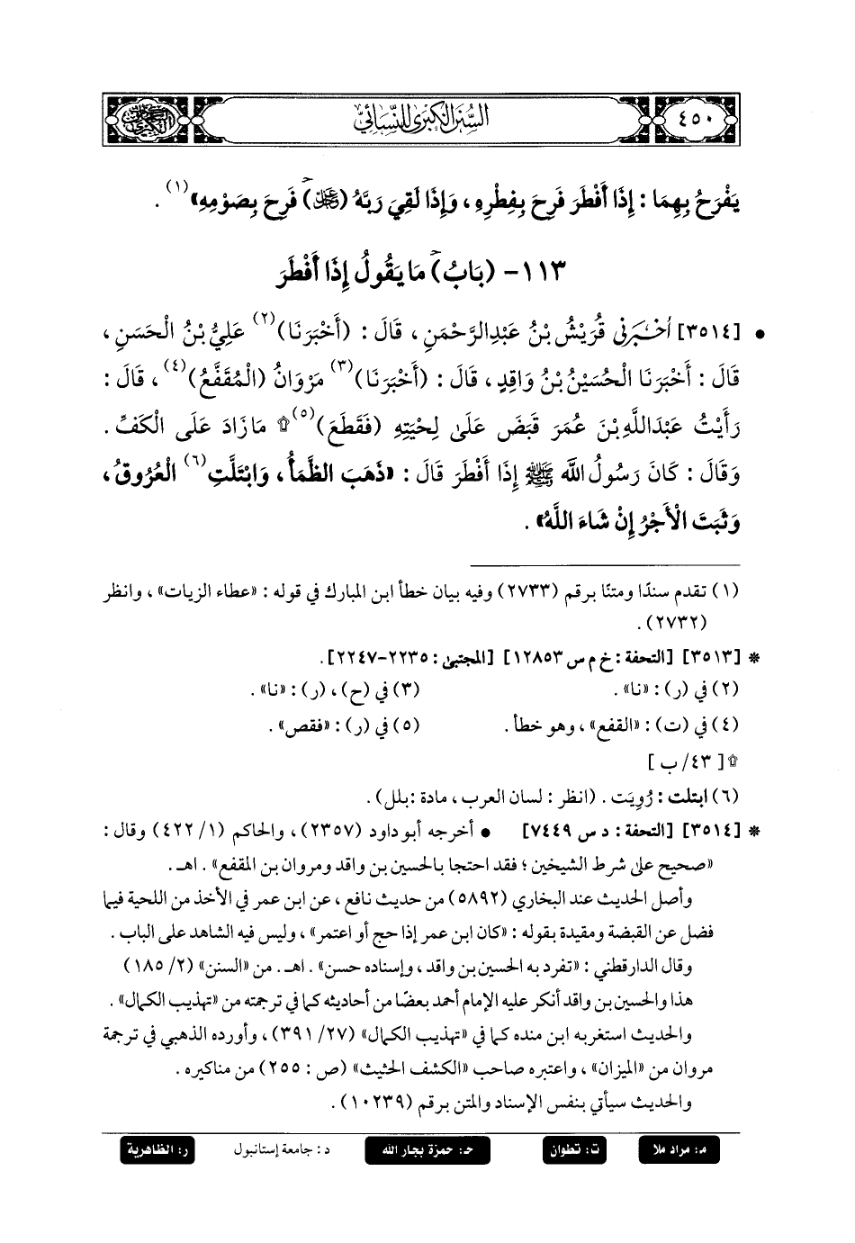 3514- أَخبَرني قُرَيْشُ بنُ عَبدِ الرَّحْمَنِ، قَالَ: أَخبَرنا عَليُّ بنُ الحَسَنِ، قَالَ: أَخبَرنا الحُسَيْنُ بنُ وَاقِدٍ، قَالَ: أَخبَرنا مَرْوَانُ المُقَفَّعُ، قَالَ: رَأَيْتُ عَبدَ اللهِ بْنَ عُمَرَ قَبَضَ عَلَى لِحْيَتِهِ فَقَطَعَ مَا زَادَ عَلَى الكَفِّ، وَقَالَ: كَانَ رَسُولُ اللهِ صَلى الله عَليه وسَلم إِذَا أَفْطَرَ قَالَ: ذَهَبَ الظَّمَأُ، وَابْتَلَّتِ العُرُوقُ، وَثَبَتَ الأَجْرُ إِنْ شَاءَ اللهُ.