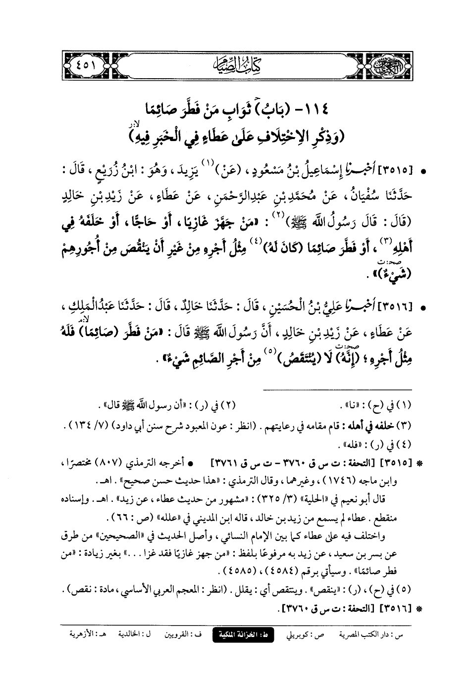3515- أَخبَرنا إِسمَاعِيلُ بنُ مَسْعُودٍ، عَن يَزِيدَ، وَهُوَ ابنُ زُرَيْعٍ، قَالَ: حَدثنا سُفْيَانُ، عَن مُحَمدِ بْنِ عَبدِ الرَّحْمَنِ، عَن عَطَاءٍ، عَن زَيْدِ بْنِ خَالِدٍ قَالَ: قَالَ رَسُولُ اللهِ صَلى الله عَليه وسَلم: مَنْ جَهَّزَ غَازِيًا، أَوْ حَاجًّا، أَوْ خَلَفَهُ فِي أَهْلِهِ، أَوْ فَطَّرَ صَائِمًا، كَانَ لَهُ مِثْلُ أَجْرِهِ مِنْ غَيْرِ أَنْ يَنْقُصَ مِنْ أُجُورِهِمْ شَيْءٌ.