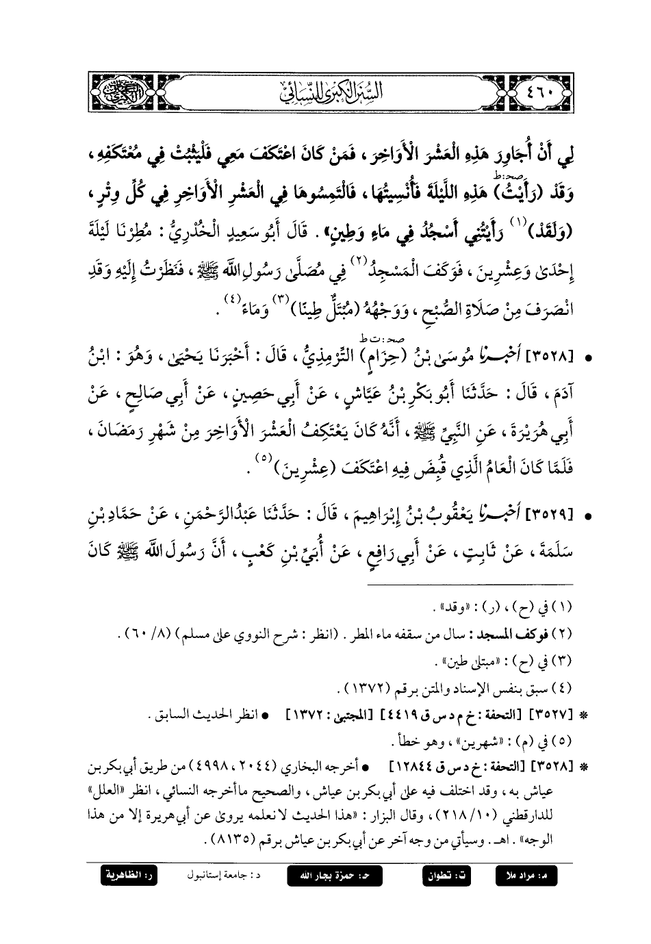 3528- أَخبَرنا مُوسَى بنُ حِزَامٍ التِّرْمِذِيُّ، قَالَ: أَخبَرنا يَحيَى، وَهُوَ ابنُ آدَمَ، قَالَ: حَدثنا أَبو بَكْرِ بنُ عَيَّاشٍ، عَن أَبي حَصِينٍ، عَن أَبي صَالِحٍ، عَن أَبي هُرَيرَةَ، عَنِ النَّبِيِّ صَلى الله عَليه وسَلم، أَنَّهُ كَانَ يَعْتَكِفُ العَشْرَ الأَوَاخِرَ مِنْ شَهْرِ رَمَضَانَ، فَلَمَّا كَانَ العَامُ الَّذِي قُبِضَ فِيهِ اعْتَكَفَ عِشْرِينَ.