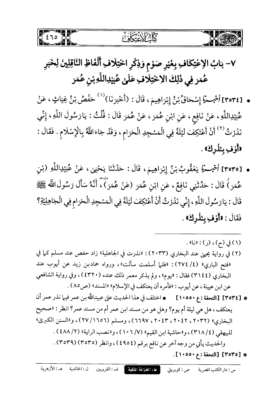 3534- أَخبَرنا إِسحَاقُ بنُ إِبرَاهِيمَ، قَالَ: أَخبَرنا حَفْصُ بنُ غِيَاثٍ، عَن عُبَيدِ اللهِ، عَن نَافِعٍ، عَنِ ابنِ عُمَرَ، عَن عُمَرَ، قَالَ: قُلْتُ: يَا رَسُولَ اللهِ، إِنِّي نَذَرْتُ أَنْ أَعْتَكِفَ لَيْلَةً فِي المَسْجِدِ الحَرَامِ، وَقَدْ جَاءَ اللهُ بِالإِسلامِ، فَقَالَ: أَوْفِ بِنَذْرِكَ.