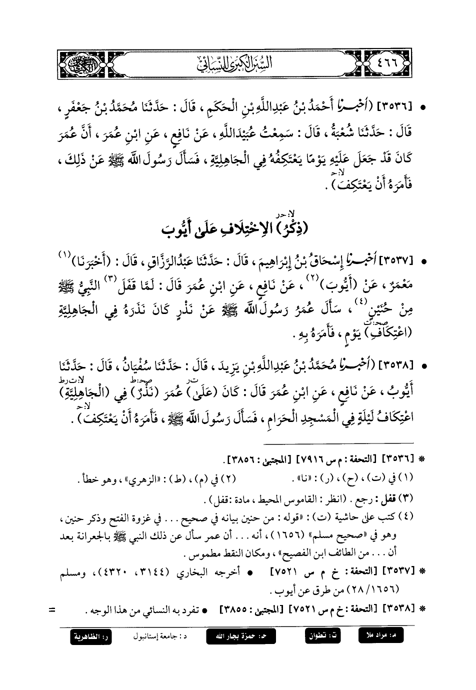 3537- أَخبَرنا إِسحَاقُ بنُ إِبرَاهِيمَ، قَالَ: حَدثنا عَبدُ الرَّزَّاقِ، قَالَ: أَخبَرنا مَعْمَرٌ، عَن أَيُّوبَ، عَن نَافِعٍ، عَنِ ابنِ عُمَرَ قَالَ: لَمَّا قَفَلَ النَّبِيُّ صَلى الله عَليه وسَلم مِنْ حُنَيْنٍ، سَأَلَ عُمَرُ رَسُولَ اللهِ صَلى الله عَليه وسَلم عَن نَذْرٍ كَانَ نَذَرَهُ فِي الجَاهِلِيَّةِ اعْتِكَافَ يَوْمٍ، فَأَمَرَهُ بِهِ.