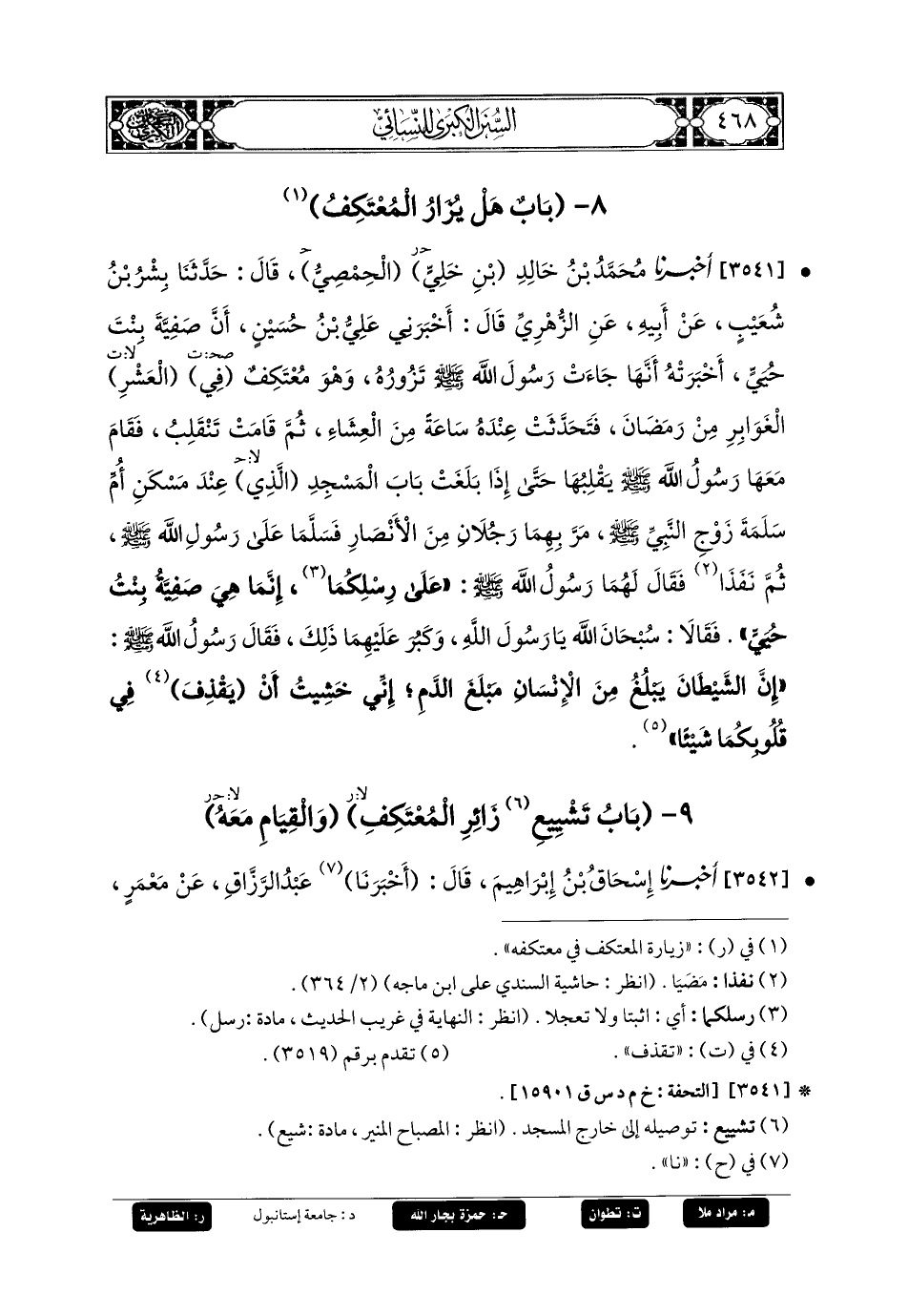 3541- أَخبَرنا مُحَمدُ بنُ خَالِدِ بْنِ خَلِيٍّ الحِمْصِيُّ، قَالَ: حَدثنا بِشْرُ بنُ شُعَيبٍ، عَن أَبيهِ، عَنِ الزُّهْرِيِّ، قَالَ: أَخبَرني عَليُّ بنُ حُسَيْنٍ، أَنَّ صَفِيَّةَ بِنْتَ حُيَيٍّ أَخبَرَتْهُ، أَنَّهَا جَاءَتْ رَسُولَ اللهِ صَلى الله عَليه وسَلم تَزُورُهُ وَهُوَ مُعْتَكِفٌ فِي العَشْرِ الغَوَابِرِ مِنْ رَمَضَانَ، فَتَحَدَّثَتْ عِنْدَهُ سَاعَةً مِنَ العِشَاءِ، ثُمَّ قَامَتْ تَنْقَلِبُ، فَقَامَ مَعَهَا رَسُولُ اللهِ صَلى الله عَليه وسَلم يَقْلِبُهَا، حَتَّى إِذَا بَلَغَتْ بَابَ المَسْجِدِ الَّذِي عِنْدَ مَسْكَنِ أُمِّ سَلَمَةَ زَوْجِ النَّبِيِّ صَلى الله عَليه وسَلم، مَرَّ بِهِمَا رَجُلانِ مِنَ الأَنْصَارِ، فَسَلَّمَا عَلَى رَسُولِ اللهِ صَلى الله عَليه وسَلم، ثُمَّ نَفَذَا، فَقَالَ لَهُمَا رَسُولُ اللهِ صَلى الله عَليه وسَلم: عَلَى رِسْلِكُمَا، إِنَّمَا هِي صَفِيَّةُ بِنْتُ حُيَيٍّ، فَقَالا: سُبْحَانَ اللهِ يَا رَسُولَ اللهِ، وَكَبُرَ عَلَيْهِمَا ذَلِكَ، فَقَالَ رَسُولُ اللهِ صَلى الله عَليه وسَلم: إِنَّ الشَّيْطَانَ يَبْلُغُ مِنَ الإِنْسَانِ مَبْلَغَ الدَّمِ، إِنِّي خَشِيتُ أَنْ يَقْذِفَ فِي قُلُوبِكُمَا شَيْئًا.