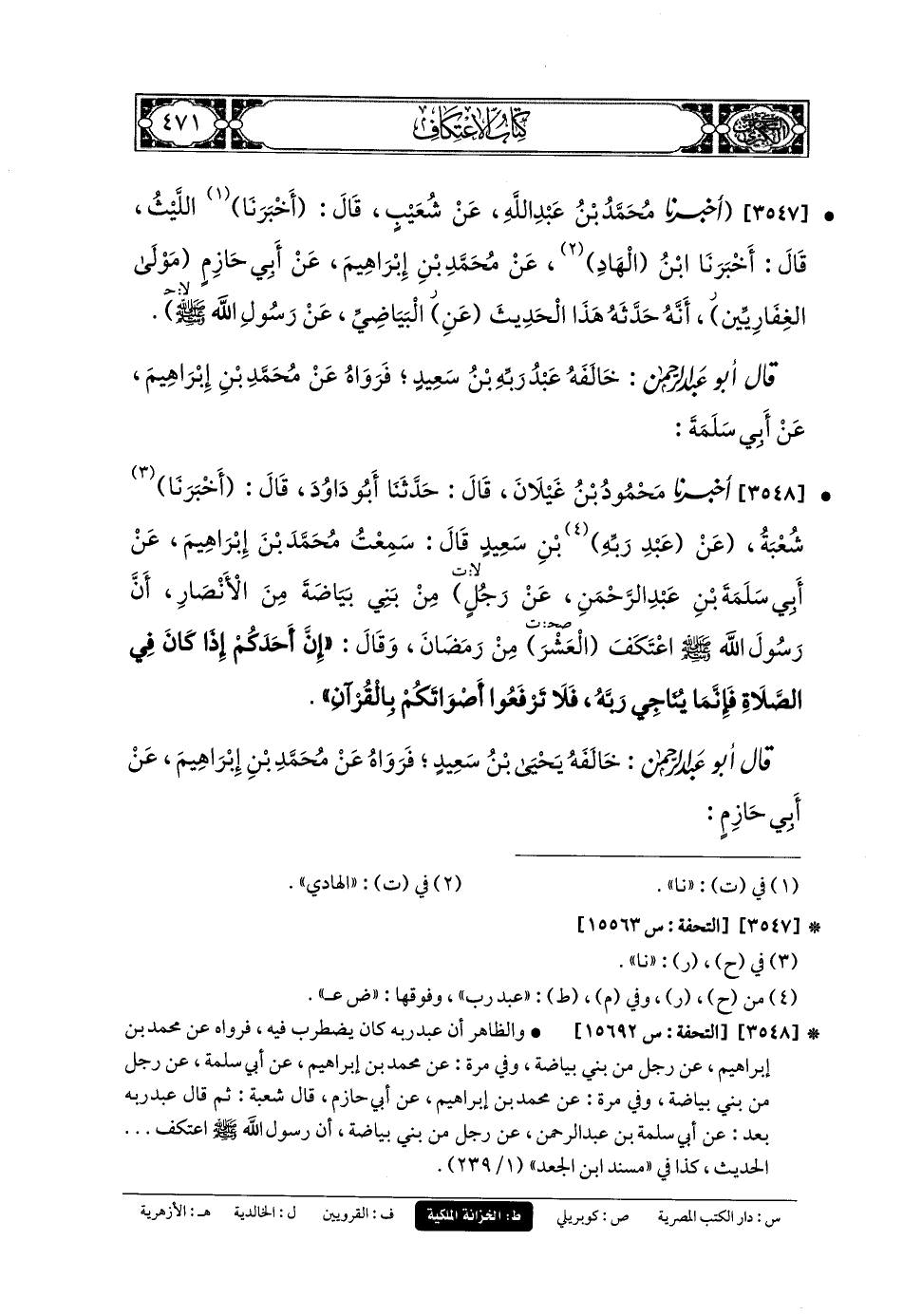 3548- أَخبَرنا مَحْمُودُ بنُ غَيْلانَ، قَالَ: حَدثنا أَبو دَاوُدَ، قَالَ: أَخبَرنا شُعبَةُ، عَن عَبدِ رَبِّهِ بْنِ سَعِيدٍ، قَالَ: سَمِعْتُ مُحَمدَ بْنَ إِبرَاهِيمَ، عَن أَبي سَلَمَةَ بْنِ عَبدِ الرَّحْمَنِ، عَن رَجُلٍ مِنْ بَنِي بَيَاضَةَ مِنَ الأَنْصَارِ، أَنَّ رَسُولَ اللهِ صَلى الله عَليه وسَلم اعْتَكَفَ العَشْرَ مِنْ رَمَضَانَ، وَقَالَ: إِنَّ أَحَدَكُمْ إِذَا كَانَ فِي الصَّلاةِ، فَإِنَّمَا يُنَاجِي رَبَّهُ، فَلا تَرْفَعُوا أَصْوَاتَكُمْ بِالقُرْآنِ.