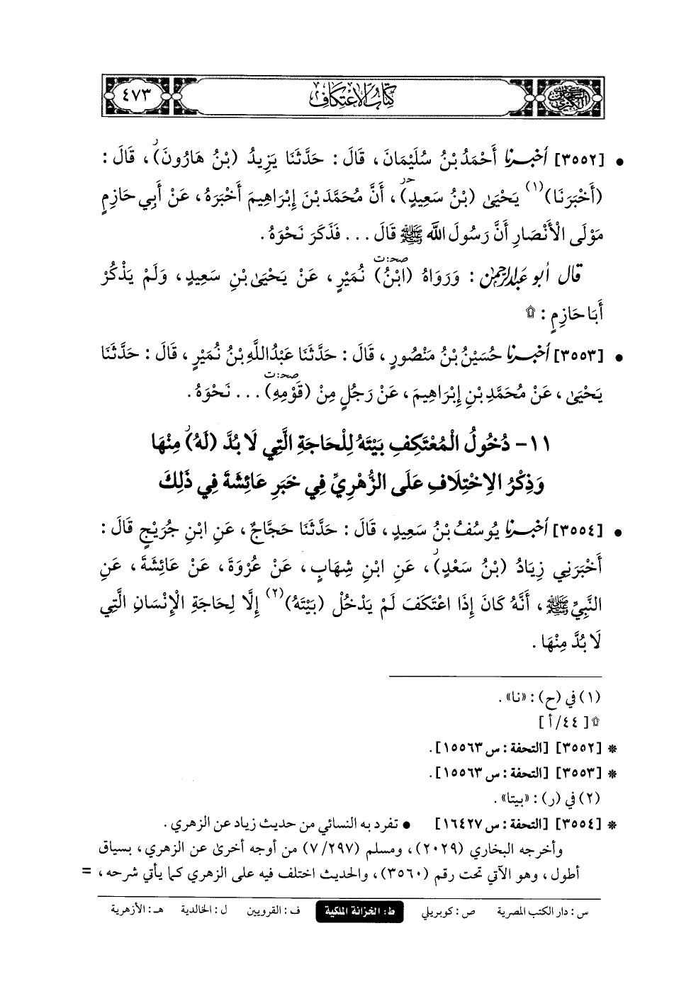 3554- أَخبَرنا يُوسُفُ بنُ سَعِيدٍ، قَالَ: حَدثنا حَجَّاجٌ، عَنِ ابنِ جُرَيْجٍ، قَالَ: أَخبَرني زِيَادُ بنُ سَعْدٍ، عَنِ ابنِ شِهَابٍ، عَن عُرْوَةَ، عَن عَائِشَةَ، عَنِ النَّبِيِّ صَلى الله عَليه وسَلم، أَنَّهُ كَانَ إِذَا اعْتَكَفَ لَمْ يَدْخُلْ بَيْتَهُ إِلاَّ لِحَاجَةِ الإِنْسَانِ الَّتِي لا بُدَّ مِنْهَا.