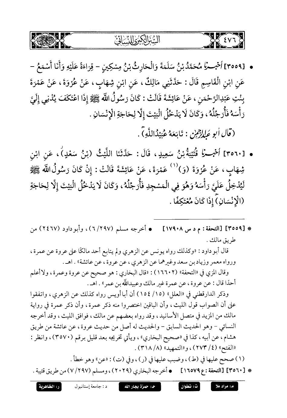 3559- أَخبَرنا مُحَمدُ بنُ سَلَمَةَ، وَالحَارِثُ بنُ مِسْكِينٍ، قِرَاءَةً عَلَيْهِ، وَأَنَا أَسْمَعُ، عَنِ ابنِ القَاسِمِ، قَالَ: حَدَّثَنِي مَالِكٌ، عَنِ ابنِ شِهَابٍ، عَن عُرْوَةَ، عَن عَمْرَةَ بِنْتِ عَبدِ الرَّحْمَنِ، عَن عَائِشَةَ، قَالَتْ: كَانَ رَسُولُ اللهِ صَلى الله عَليه وسَلم إِذَا اعْتَكَفَ يُدْنِي إِلَيَّ رَأْسَهُ فَأُرَجِّلُهُ، وَكَانَ لا يَدْخُلُ البَيْتَ إِلاَّ لِحَاجَةِ الإِنْسَانِ.