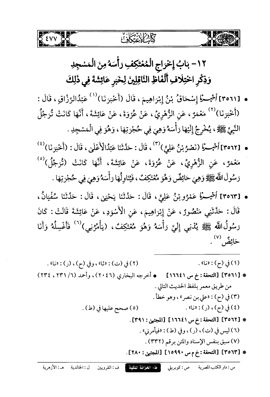 3562- أَخبَرنا نَصْرُ بنُ عَليٍّ، قَالَ: حَدثنا عَبدُ الأَعْلَى، قَالَ: أَخبَرنا مَعْمَرٌ، عَنِ الزُّهْرِيِّ، عَن عُرْوَةَ، عَن عَائِشَةَ، أَنَّهَا كَانَتْ تُرَجِّلُ رَسُولَ اللهِ صَلى الله عَليه وسَلم وَهِيَ حَائِضٌ وَهُوَ مُعْتَكِفٌ، فَيُنَاوِلُهَا رَأْسَهُ وَهِيَ فِي حُجْرَتِهَا.