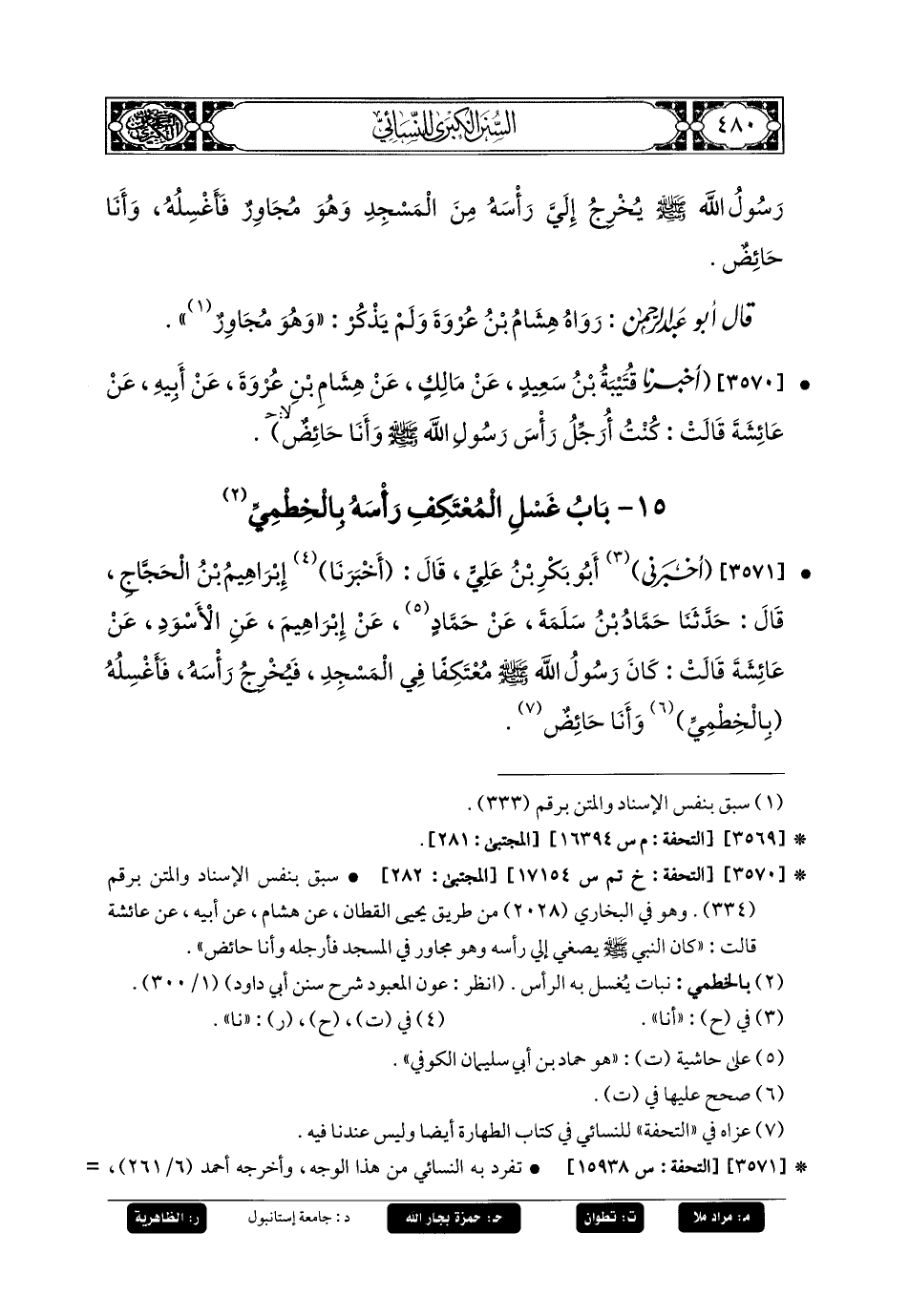 3571- أَخبَرني أَبو بَكْرِ بنُ عَليٍّ، قَالَ: أَخبَرنا إِبرَاهِيمُ بنُ الحَجَّاجِ، قَالَ: حَدثنا حَمَّادُ بنُ سَلَمَةَ، عَن حَمَّادٍ، عَن إِبرَاهِيمَ، عَنِ الأَسْوَدِ، عَن عَائِشَةَ، قَالَتْ: كَانَ رَسُولُ اللهِ صَلى الله عَليه وسَلم مُعْتَكِفًا فِي المَسْجِدِ، فَيُخْرِجُ رَأْسَهُ فَأَغْسِلُهُ بِالخِطْمِيِّ وَأَنَا حَائِضٌ.
