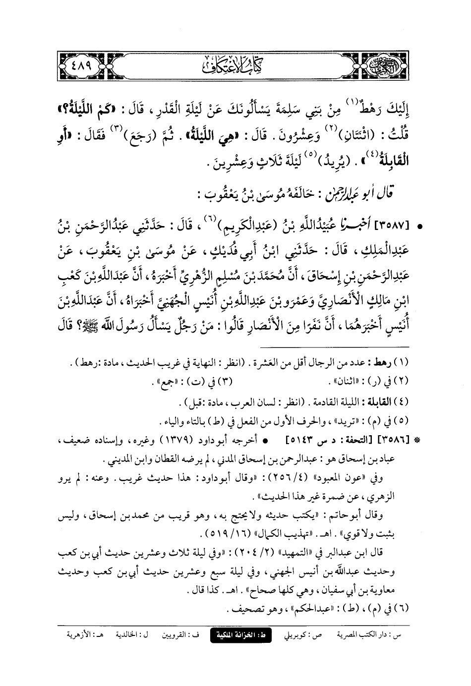 3587- أَخبَرنا عُبَيدُ اللهِ بنُ عَبدِ الكَرِيمِ، قَالَ: حَدَّثَنِي عَبدُ الرَّحْمَنِ بنُ عَبدِ المَلِكِ، قَالَ: حَدَّثَنِي ابنُ أَبي فُدَيْكٍ، عَن مُوسَى بْنِ يَعقُوبَ، عَن عَبدِ الرَّحْمَنِ بْنِ إِسحَاقَ، أَنَّ مُحَمدَ بْنَ مُسْلِمٍ الزُّهْرِيَّ أَخبَرَهُ؛ أَنَّ عَبدَ اللهِ بْنَ كَعْبِ بْنِ مَالِكٍ الأَنْصَارِيَّ، وَعَمْرَو بْنَ عَبدِ اللهِ بْنِ أُنَيْسٍ الجُهَنِيَّ أَخبَرَاهُ، أَنَّ عَبدَ اللهِ بْنَ أُنَيْسٍ أَخبَرَهُمَا، أَنَّ نَفَرًا مِنَ الأَنْصَارِ قَالُوا: مَنْ رَجُلٌ يَسْأَلُ رَسُولَ اللهِ صَلى الله عَليه وسَلم؟ قَالَ عَبدُ اللهِ: فَقُلْتُ: أَنَا، قَالُوا: اذْهَبْ فَسَلْهُ لَنَا مَتَى لَيْلَةُ القَدْرِ، فَخَرَجْتُ حَتَّى وَافَيْتُ غُرُوبَ الشَّمْسِ عِنْدَ بَعْضِ أَبْيَاتِ رَسُولِ اللهِ صَلى الله عَليه وسَلم، ثُمَّ إِنَّ النَّبِيَّ صَلى الله عَليه وسَلم خَرَجَ فَصَلَّى المَغْرِبَ، فَلَمَّا صَلَّى وَفَرَغَ، خَرَجْتُ مَعَهُ حَتَّى دَخَلَ بَيْتَهُ وَأَنَا مَعَهُ، فَدَعَا رَسُولُ اللهِ صَلى الله عَليه وسَلم بِفِطْرِهِ، فَلَمَّا فَرَغَ رَسُولُ اللهِ صَلى الله عَليه وسَلم دَعَا بِنَعْلَيْهِ، ثُمَّ قَالَ: إِنِّي لأَظُنُّ أَنَّ لَكَ حَاجَةً، قُلْتُ: أَجَلْ يَا رَسُولَ اللهِ، أَرْسَلَنِي إِلَيْكَ فُلانٌ وَفُلانٌ يَسْأَلُونَكَ مَتَى لَيْلَةُ القَدْرِ؟ فَقَالَ: اللَّيْلَةَ، وَتِلْكَ لَيْلَةُ اثْنَيْنِ وَعِشْرِينَ مِنْ رَمَضَانَ، فَقُلْتُ: اللَّيْلَةُ لَيْلَةُ اثْنَيْنِ وَعِشْرِينَ مِنْ رَمَضَانَ؟ قَالَ: بَلِ القَابِلَةُ، لَيْلَةَ ثَلاثٍ وَعِشْرِينَ.