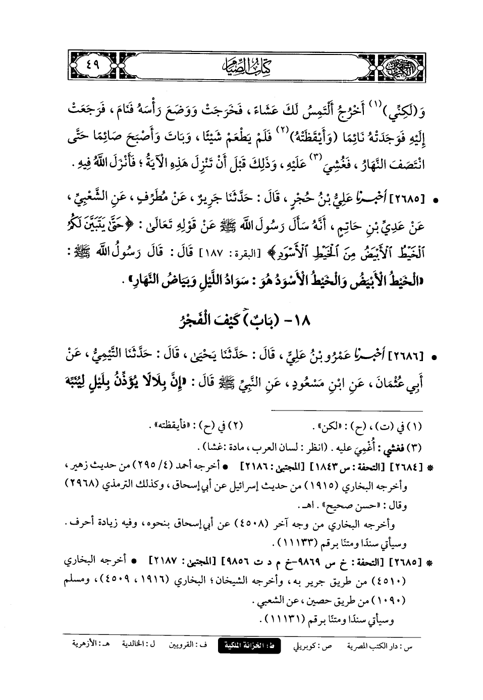 2685- أَخبَرنا عَليُّ بنُ حُجْرٍ، قَالَ: حَدثنا جَرِيرٌ، عَن مُطَرِّفٍ، عَنِ الشَّعْبِيِّ، عَن عَدِيِّ بْنِ حَاتِمٍ، أَنَّهُ سَأَلَ رَسُولَ اللهِ صَلى الله عَليه وسَلم عَن قَوْلِهِ تَعَالى: {حَتَّى يَتَبَيَّنَ لَكُمُ الخَيْطُ الأَبْيَضُ مِنَ الخَيْطِ الأَسْوَدِ} قَالَ: قَالَ رَسُولُ اللهِ صَلى الله عَليه وسَلم: الخَيْطُ الأَبْيَضُ والخَيْطُ الأَسْوَدُ هُو سَوَادُ اللَّيْلِ وَبَيَاضُ النَّهَارِ.
