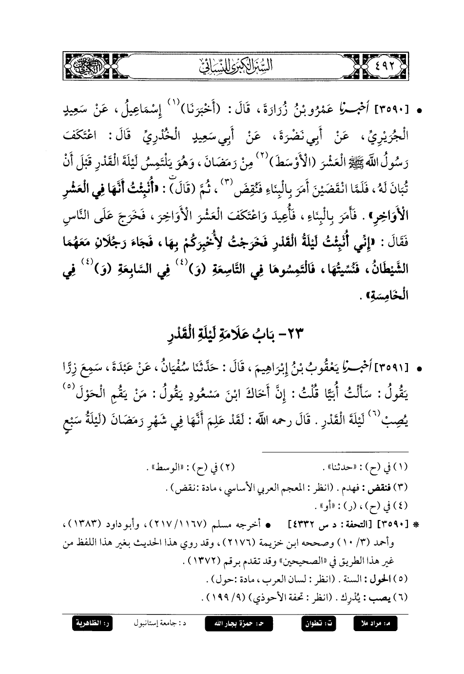 3591- أَخبَرنا يَعقُوبُ بنُ إِبرَاهِيمَ، قَالَ: حَدثنا سُفْيَانُ، عَن عَبدَةَ، سَمِعَ زِرًّا، يَقُولُ: سَأَلْتُ أُبَيًّا، قُلْتُ: إِنَّ أَخَاكَ ابنَ مَسْعُودٍ يَقُولُ: مَنْ يَقُمِ الحَوْلَ يُصِبْ لَيْلَةَ القَدْرِ، قَالَ رَحِمَهُ اللهُ: لَقَدْ عَلِمَ أَنَّهَا فِي شَهْرِ رَمَضَانَ لَيْلَةُ سَبْعٍ وَعِشْرِينَ، ثُمَّ يَحْلِفُ لا يَسْتَثْنِي، إِنَّهَا لَيْلَةُ سَبْعٍ وَعِشْرِينَ، قُلْتُ: بِأَيِّ شَيْءٍ تَقُولُ ذَاكَ يَا أَبَا المُنْذِرِ؟ قَالَ: بِالعَلامَةِ الَّتِي أَخبَرنا بِهَا رَسُولُ اللهِ صَلى الله عَليه وسَلم أَنَّهَا تَطْلُعُ يَوْمَئِذٍ لا شُعَاعَ لَهَا.