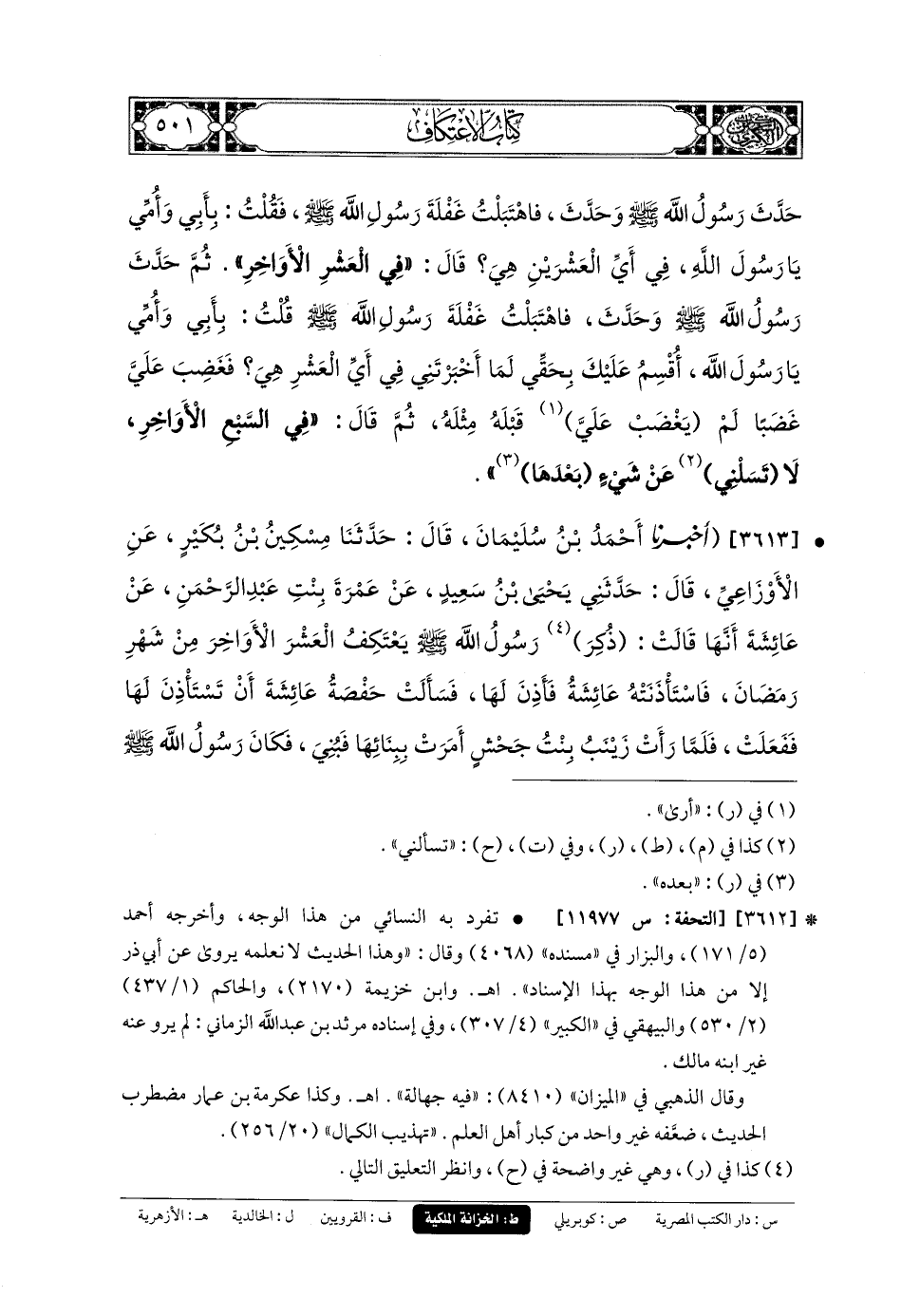 3613- أَخبَرنا أَحْمَدُ بنُ سُلَيمَانَ، قَالَ: حَدثنا مِسْكِينُ بنُ بُكَيْرٍ، عَنِ الأَوْزَاعِيِّ، قَالَ: حَدَّثَنِي يَحيَى بنُ سَعِيدٍ، عَنْ عَمْرَةَ بِنْتِ عَبدِ الرَّحْمَنِ، عَنْ عَائِشَةَ، أَنَّهَا قَالَتْ: ذُكِرَ رَسُولُ اللهِ صَلى الله عَليه وسَلم يَعْتَكِفُ العَشْرَ الأَوَاخِرَ مِنْ شَهْرِ رَمَضَانَ، فَاسْتَأْذَنَتْهُ عَائِشَةُ فَأَذِنَ لَهَا، فَسَأَلَتْ حَفْصَةُ عَائِشَةَ أَنْ تَسْتَأْذِنَ لَهَا، فَفَعَلَتْ، فَلَمَّا رَأَتْ زَيْنَبُ بِنْتُ جَحْشٍ، أَمَرَتْ بِبِنَائِهَا فَبُنِيَ، فَكَانَ رَسُولُ اللهِ صَلى الله عَليه وسَلم إِذَا صَلَّى انْصَرَفَ إِلَى بِنَائِهِ، فَيَمُرُّ بِالأَبْنِيَةِ، فَقَالَ: مَا هَذَا؟ قَالُوا: هَذَا بِنَاءُ عَائِشَةَ، وَحَفْصَةَ، وَزَيْنَبَ، فَقَالَ: آلْبِرَّ يُرِدْنَ بِهَذَا؟ مَا أَنَا بِمُعْتَكِفٍ، فَانْصَرَفَ، فَلَمَّا أَفْطَرَ اعْتَكَفَ عَشْرٌ مِنْ شَوَّالٍ (1).
