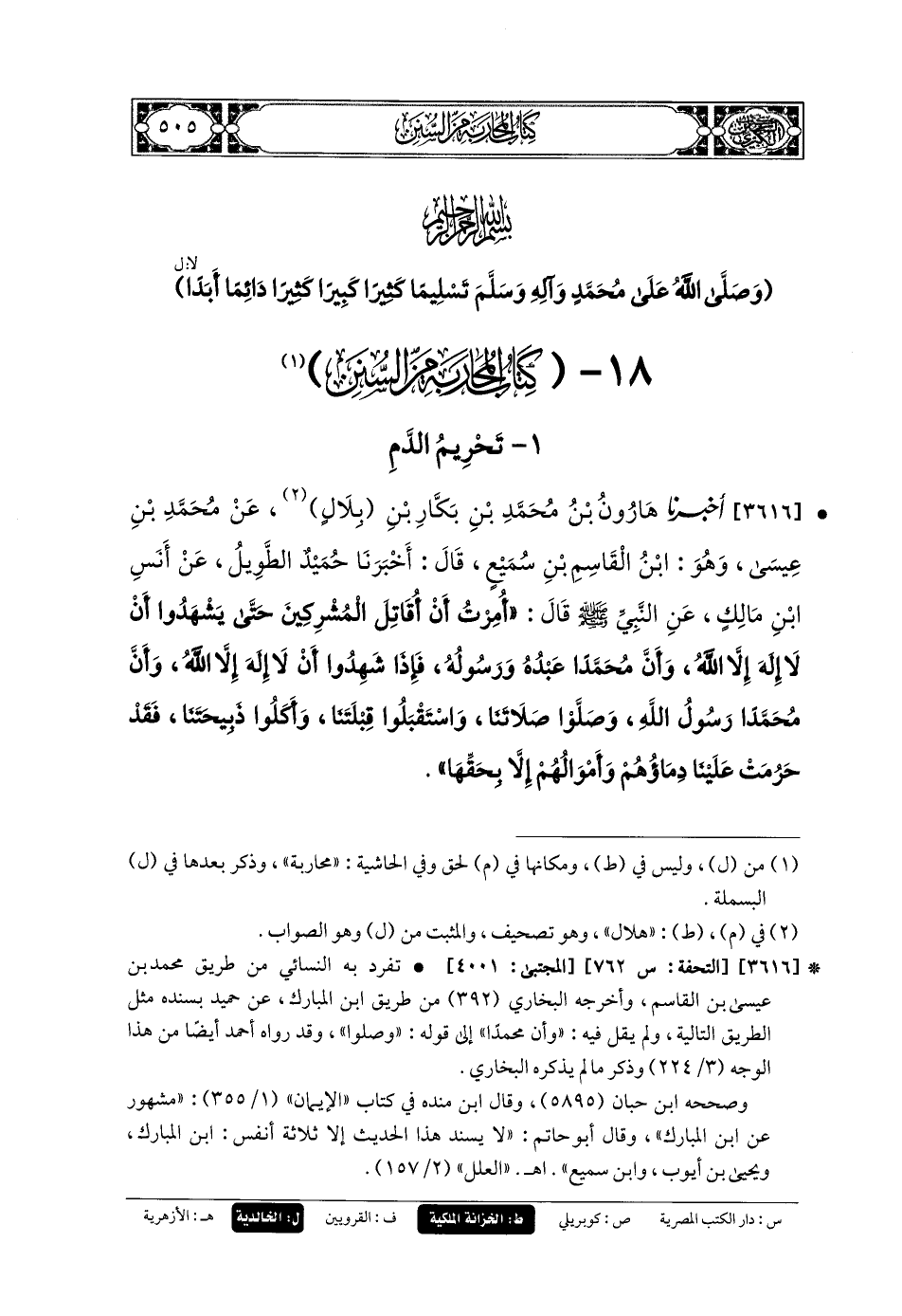 3616 - أَخبَرنا هَارُونُ بنُ مُحَمدِ بْنِ بَكَّارِ بْنِ بِلالٍ، عَن مُحَمدِ بْنِ عِيسَى، وَهُوَ ابنُ القَاسِمِ بْنِ سُمَيْعٍ، قَالَ: أَخبَرنا حُمَيْدٌ الطَّوِيلُ، عَن أَنَسِ بْنِ مَالِكٍ، عَنِ النَّبِيِّ صَلى الله عَليه وسَلم قَالَ: أُمِرْتُ أَنْ أُقَاتِلَ المُشْرِكِينَ حَتَّى يَشْهَدُوا أَنْ لا إِلَهَ إِلاَّ اللهُ، وَأَنَّ مُحَمدًا عَبدُهُ وَرَسُولُهُ، فَإِذَا شَهِدُوا أَنْ لا إِلَهَ إِلاَّ اللهُ، وَأَنَّ مُحَمدًا رَسُولُ اللهِ، وَصَلَّوْا صَلاتَنَا، وَاسْتَقْبَلُوا قِبْلَتَنَا، وَأَكَلُوا ذَبِيحَتَنَا، فَقَدْ حَرُمَتْ عَلَيْنَا دِمَاؤُهُمْ وَأَمْوَالُهُمْ إِلاَّ بِحَقِّهَا.