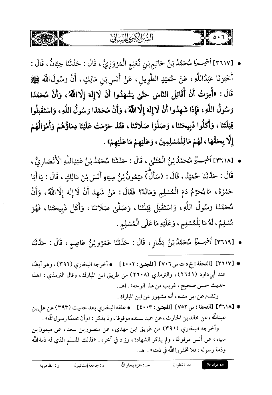 3617 - أَخبَرنا مُحَمدُ بنُ حَاتِمِ بْنِ نُعَيْمٍ المَرْوَزِيُّ، قَالَ: حَدثنا حِبَّانُ، قَالَ: أَخبَرنا عَبدُ اللهِ، عَن حُمَيْدٍ الطَّوِيلِ، عَن أَنَسِ بْنِ مَالِكٍ، أَنَّ رَسُولَ اللهِ صَلى الله عَليه وسَلم قَالَ: أُمِرْتُ أَنْ أُقَاتِلَ النَّاسَ حَتَّى يَشْهَدُوا أَنْ لا إِلَهَ إِلاَّ اللهُ، وَأَنَّ مُحَمدًا رَسُولُ اللهِ، فَإِذَا شَهِدُوا أَنْ لا إِلَهَ إِلاَّ اللهُ، وَأَنَّ مُحَمدًا رَسُولُ اللهِ، وَاسْتَقْبَلُوا قِبْلَتَنَا، وَأَكَلُوا ذَبِيحَتَنَا، وَصَلَّوْا صَلاتَنَا، فَقَدْ حَرُمَتْ عَلَيْنَا دِمَاؤُهُمْ وَأَمْوَالُهُمْ إِلاَّ بِحَقِّهَا، لَهُمْ مَا لِلْمُسْلِمِينَ وَعَلَيْهِمْ مَا عَلَيْهِمْ.