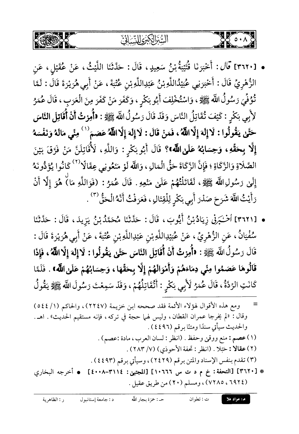 3620 - قَالَ: أَخبَرنا قُتَيبَةُ بنُ سَعِيدٍ، قَالَ: حَدثنا اللَّيْثُ، عَن عُقَيْلٍ، عَنِ الزُّهْرِيِّ، قَالَ: أَخبَرني عُبَيدُ اللهِ بنُ عَبدِ اللهِ بْنِ عُتْبَةَ، عَن أَبي هُرَيرَةَ قَالَ: لَمَّا تُوُفِّيَ رَسُولُ اللهِ صَلى الله عَليه وسَلم، وَاسْتُخْلِفَ أَبو بَكْرٍ، وَكَفَرَ مَنْ كَفَرَ مِنَ العَرَبِ، قَالَ عُمَرُ لأَبي بَكْرٍ: كَيْفَ تُقَاتِلُ النَّاسَ، وَقَدْ قَالَ رَسُولُ اللهِ صَلى الله عَليه وسَلم: أُمِرْتُ أَنْ أُقَاتِلَ النَّاسَ حَتَّى يَقُولُوا: لا إِلَهَ إِلاَّ اللهُ، فَمَنْ قَالَ لا إِلَهَ إِلاَّ اللهُ، عَصَمَ مِنِّي مَالَهُ وَنَفْسَهُ إِلاَّ بِحَقِّهِ وَحِسَابُهُ عَلَى اللهِ، قَالَ أَبو بَكْرٍ: وَاللهِ لأُقَاتِلَنَّ مَنْ فَرَّقَ بَيْنَ الصَّلاةِ وَالزَّكَاةِ، فَإِنَّ الزَّكَاةَ حَقُّ المَالِ، وَاللهِ لَو مَنَعُونِي عِقَالاً كَانُوا يُؤَدُّونَهُ إِلَى رَسُولِ اللهِ صَلى الله عَليه وسَلم لَقَاتَلْتُهُمْ عَلَى مَنْعِهِ، قَالَ عُمَرُ: فَوَاللهِ مَا هُوَ إِلاَّ أَنْ رَأَيْتُ اللهَ شَرَحَ صَدْرَ أَبي بَكْرٍ لِلْقِتَالِ، فَعَرَفْتُ أَنَّهُ الحَقُّ.