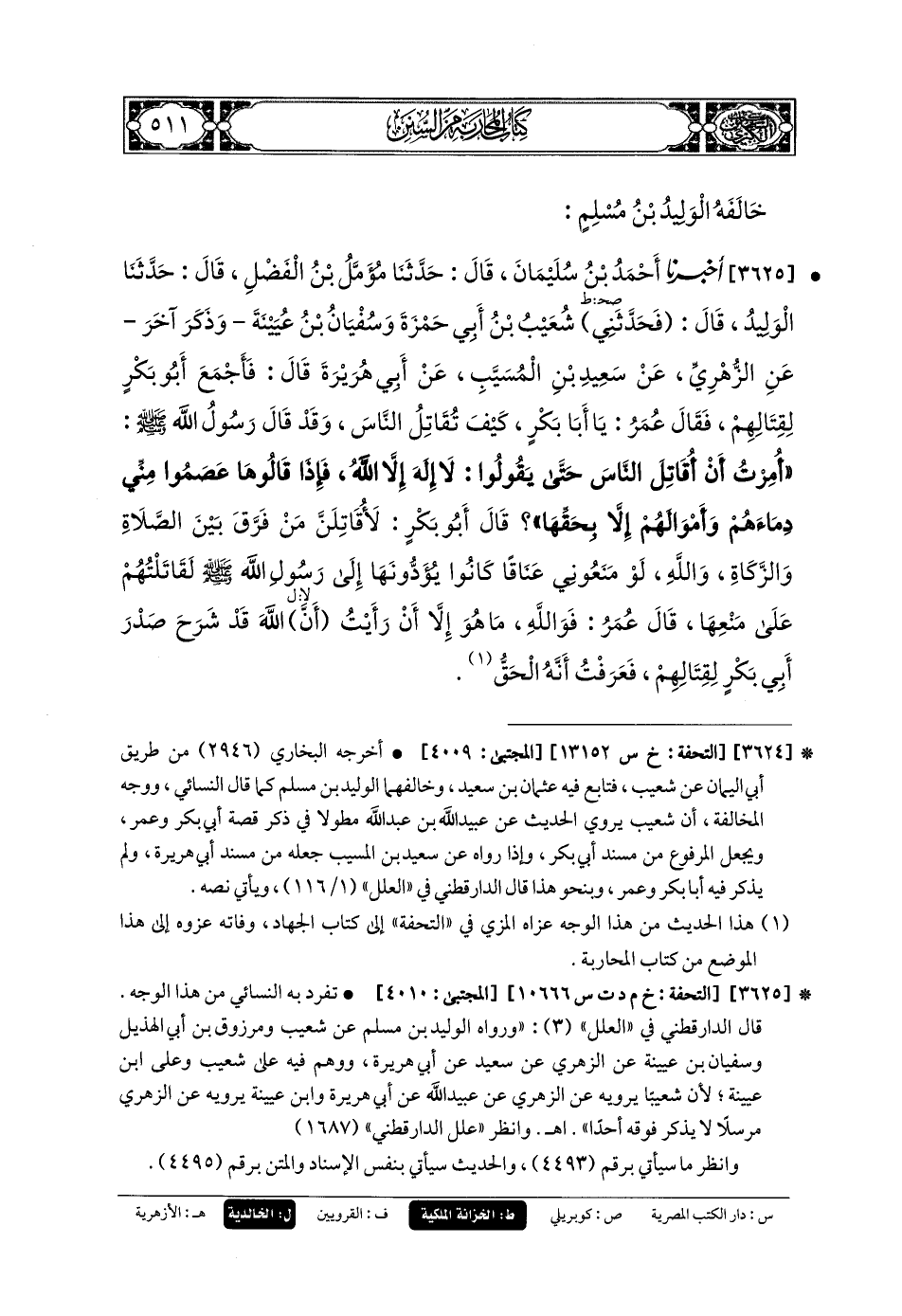 3625 - أَخبَرنا أَحْمَدُ بنُ سُلَيمَانَ، قَالَ: حَدثنا مُؤَمَّلُ بنُ الفَضْلِ، قَالَ: حَدثنا الوَلِيدُ، قَالَ: فَحَدَّثَنِي شُعَيبُ بنُ أَبي حَمْزَةَ، وَسُفْيَانُ بنُ عُيَيْنَةَ، وَذَكَرَ آخَرَ، عَنِ الزُّهْرِيِّ، عَن سَعِيدِ بْنِ المُسَيَّبِ، عَن أَبي هُرَيرَةَ قَالَ: فَأَجْمَعَ أَبو بَكْرٍ لِقِتَالِهِمْ، فَقَالَ عُمَرُ: يَا أَبَا بَكْرٍ، كَيْفَ تُقَاتِلُ النَّاسَ، وَقَدْ قَالَ رَسُولُ اللهِ صَلى الله عَليه وسَلم: أُمِرْتُ أَنْ أُقَاتِلَ النَّاسَ حَتَّى يَقُولُوا: لا إِلَهَ إِلاَّ اللهُ، فَإِذَا قَالُوهَا عَصَمُوا مِنِّي دِمَاءَهُمْ وَأَمْوَالَهُمْ إِلاَّ بِحَقِّهَا؟ قَالَ أَبو بَكْرٍ: لأُقَاتِلَنَّ مَنْ فَرَّقَ بَيْنَ الصَّلاةِ وَالزَّكَاةِ، وَاللهِ لَو مَنَعُونِي عَنَاقًا كَانُوا يُؤَدُّونَهَا إِلَى رَسُولِ اللهِ صَلى الله عَليه وسَلم لَقَاتَلْتُهُمْ عَلَى مَنْعِهَا، قَالَ عُمَرُ: فَوَاللَّهِ مَا هُوَ إِلاَّ أَنْ رَأَيْتُ أَنَّ اللهَ قَدْ شَرَحَ صَدْرَ أَبي بَكْرٍ لِقِتَالِهِمْ، فَعَرَفْتُ أَنَّهُ الحَقُّ.