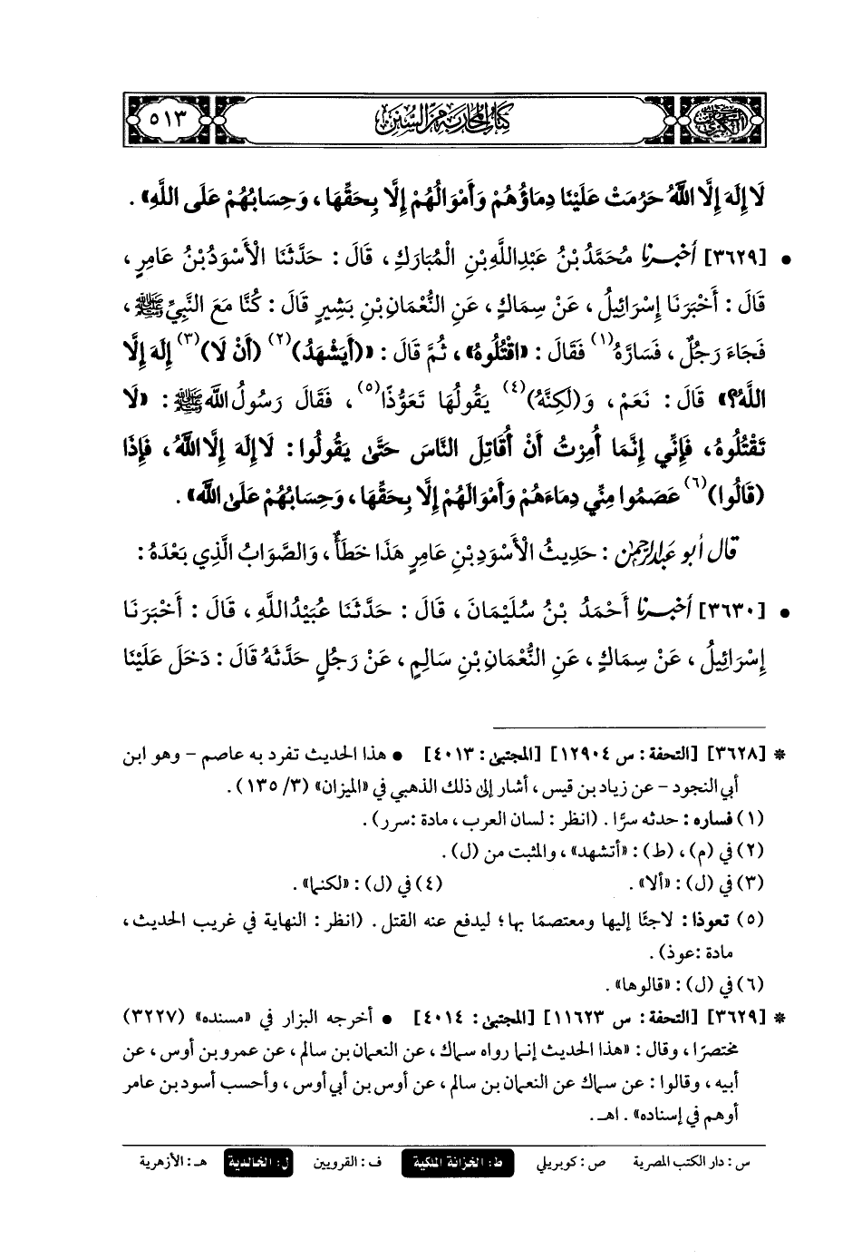 3629 - أَخبَرنا مُحَمدُ بنُ عَبدِ اللهِ بْنِ المُبَارَكِ، قَالَ: حَدثنا الأَسْوَدُ بنُ عَامِرٍ، قَالَ: أَخبَرنا إِسرَائِيلُ، عَن سِمَاكٍ، عَنِ النُّعْمَانِ بْنِ بَشِيرٍ، قَالَ: كُنَّا مَعَ النَّبِيِّ صَلى الله عَليه وسَلم، فَجَاءَ رَجُلٌ فَسَارَّهُ، فَقَالَ: اقْتُلُوهُ، ثُمَّ قَالَ: أَيَشْهَدُ أَنْ لا إِلَهَ إِلاَّ اللهُ؟ قَالَ: نَعَمْ، وَلَكِنَّهُ يَقُولُهَا تَعَوُّذًا، فَقَالَ رَسُولُ اللهِ صَلى الله عَليه وسَلم: لا تَقْتُلُوهُ، فَإِنِّي إِنَّمَا أُمِرْتُ أَنْ أُقَاتِلَ النَّاسَ حَتَّى يَقُولُوا: لا إِلَهَ إِلاَّ اللهُ، فَإِذَا قَالُوا عَصَمُوا مِنِّي دِمَاءَهُمْ وَأَمْوَالَهُمْ إِلاَّ بِحَقِّهَا، وَحِسَابُهُمْ عَلَى اللهِ.