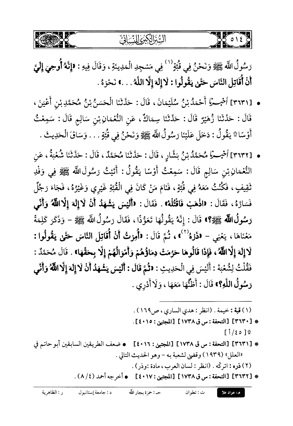 3632 - أَخبَرنا مُحَمدُ بنُ بَشَّارٍ، قَالَ: حَدثنا مُحَمدٌ، قَالَ: حَدثنا شُعبَةُ، عَنِ النُّعْمَانِ بْنِ سَالِمٍ، قَالَ: سَمِعْتُ أَوْسًا يَقُولُ: أَتَيْتُ رَسُولَ اللهِ صَلى الله عَليه وسَلم فِي وَفْدِ ثَقِيفٍ، فَكُنْتُ مَعَهُ فِي قُبَّةٍ، فَنَامَ مَنْ كَانَ فِي القُبَّةِ غَيْرِي وَغَيْرُهُ، فَجَاءَ رَجُلٌ فَسَارَّهُ، فَقَالَ: اذْهَبْ فَاقْتُلْهُ، فَقَالَ: أَلَيْسَ يَشْهَدُ أَنْ لا إِلَهَ إِلاَّ اللهُ، وَأَنِّي رَسُولُ اللهِ؟ قَالَ: إِنَّهُ يَقُولُهَا تَعَوُّذًا، فَقَالَ رَسُولُ اللهِ صَلى الله عَليه وسَلم: وَذَكَرَ كَلِمَةً مَعْنَاهَا، يَعْنِي ذَرْهُ، ثُمَّ قَالَ: أُمِرْتُ أَنْ أُقَاتِلَ النَّاسَ حَتَّى يَقُولُوا: لا إِلَهَ إِلاَّ اللهُ، فَإِذَا قَالُوهَا حَرُمَتْ دِمَاؤُهُمْ وَأَمْوَالُهُمْ إِلاَّ بِحَقِّهَا.