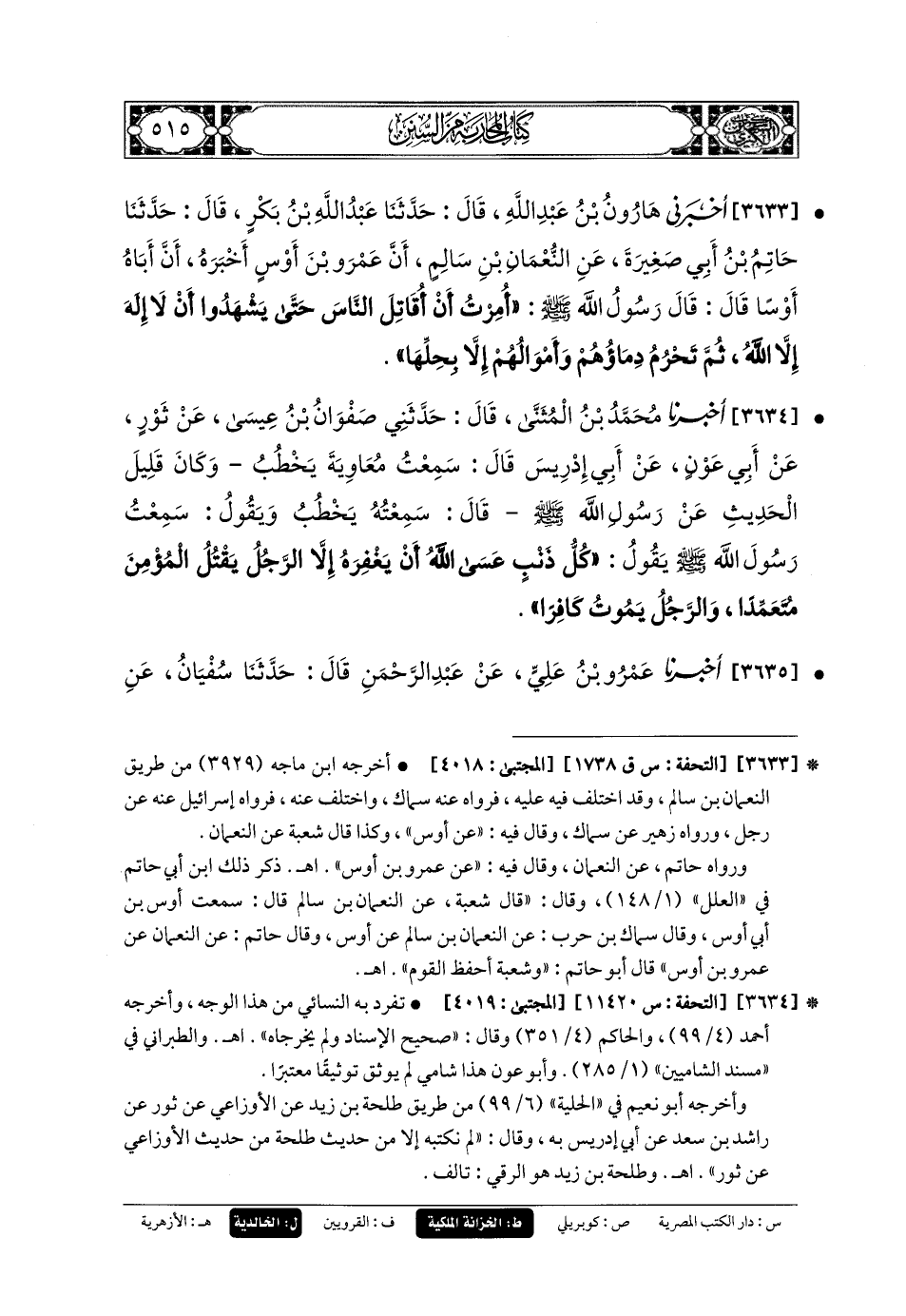 3633 - أَخبَرني هَارُونُ بنُ عَبدِ اللهِ، قَالَ: حَدثنا عَبدُ اللهِ بنُ بَكْرٍ، قَالَ: حَدثنا حَاتِمُ بنُ أَبي صَغِيرَةَ، عَنِ النُّعْمَانِ بْنِ سَالِمٍ، أَنَّ عَمْرَو بْنَ أَوْسٍ أَخبَرَهُ؛ أَنَّ أَبَاهُ أَوْسًا قَالَ: قَالَ رَسُولُ اللهِ صَلى الله عَليه وسَلم: أُمِرْتُ أَنْ أُقَاتِلَ النَّاسَ حَتَّى يَشْهَدُوا أَنْ لا إِلَهَ إِلاَّ اللهُ، ثُمَّ تَحْرُمُ دِمَاؤُهُمْ وَأَمْوَالُهُمْ إِلاَّ بِحِلِّهَا.
