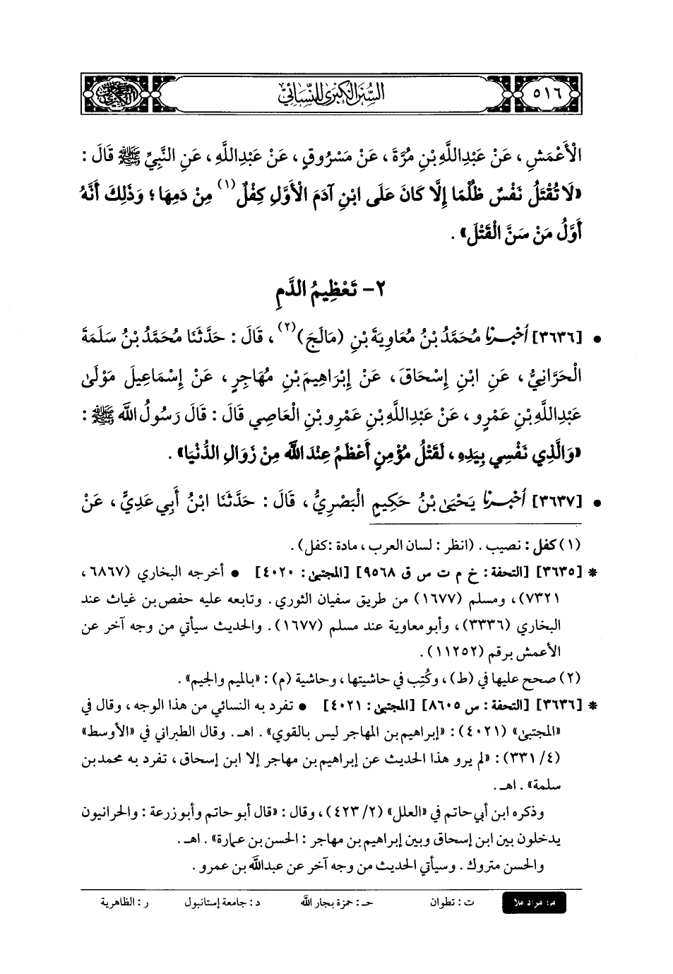 3636 - أَخبَرنا مُحَمدُ بنُ مُعاويَةَ بْنِ مَالَجَ، قَالَ: حَدثنا مُحَمدُ بنُ سَلَمَةَ الحَرَّانِيُّ، عَنِ ابنِ إِسحَاقَ، عَن إِبرَاهِيمَ بْنِ مُهَاجِرٍ، عَن إِسمَاعِيلَ، مَوْلَى عَبدِ اللهِ بْنِ عَمْرٍو، عَن عَبدِ اللهِ بْنِ عَمْرِو بْنِ العَاصِ قَالَ: قَالَ رَسُولُ اللهِ صَلى الله عَليه وسَلم: وَالَّذِي نَفْسِي بِيَدِهِ، لَقَتْلُ مُؤْمِنٍ أَعْظَمُ عِنْدَ اللهِ مِنْ زَوَالِ الدُّنْيَا.